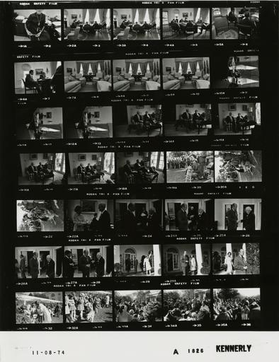 | Keywords: Ford A1826 NLGRF photo contact sheet (1974-11-08)(Gerald Ford Library).jpg White House Photographic Office WHPO is housed at the Gerald R Ford Presidential Library a branch of the National Archives and Records Administration NARA <br/><br/> This file is a 200 dpi photo contact sheet having images from roll of film A1826 of the August 9 1974 - January 20 1977 Gerald R Ford White House Photographic Office Series A0001-A9999 and B0001-B2886 photographs <br/><br/> The date on the photo contact sheet is the date the roll of film was processed not necessarily the date the photographs were taken See table below for additional details 1974-11-08 Gerald R Ford Presidential Library Image http //www fordlibrarymuseum gov/library/whphotos/A1826_NLGRF jpg A1826_NLGRF jpg from http //www fordlibrarymuseum gov/library/whphotos/19741108whpo pdf White House Photographs November 8 1974 of the http //www fordlibrarymuseum gov/Library/whphotos/whpo asp White House Photographic Collection page White House Photographic Office WHPO <br/> Creator David Hume Kennerly PD-USGov Institution Institution Gerald R Ford Presidential Library Table wikitable sortable + Photo contact sheet A1826 U S President Ford Administration Gerald R Ford Library Frame s Tone Subject proper Subject generic Names Geographic Location Photographer Date - 2 BW Staff Assistant seated at desk Nell Yates Scheduling and Advance Office Kennerly 1974-11-08 - 3-5 BW seated around desk - various angles GRF Hartmann Cheney Marsh Rumsfeld Burch Oval Office Kennerly 1974-11-08 - 6-7 BW seated near desk Rumsfeld Burch Oval Office Kennerly 1974-11-08 - 8-10 BW seated at desk; talking on telephone smoking pipe wearing vest without suit jacket; taken from fireplace sofas in foreground GRF Oval Office Kennerly 1974-11-08 - 11-13 BW seated at desk; talking on telephone smoking pipe wearing vest without suit jacket GRF Oval Office Kennerly 1974-11-08 - 14-19 BW Deputy Attorney General - Pet Golden Retriever seated on sofa talking dog moving around room Buchen Laurence Silberman Liberty Scheduling and Advance Office Kennerly 1974-11-08 - 20-22 BW Students from Fox Hill Elementary School Bowie MD - Pet Golden Retriever man petting dog Students in background Students Liberty Unidentified Man Rose Garden Kennerly 1974-11-08 - 23 BW Staff Assistant standing talking; Yates seated in background Betty Ford Nell Yates Unidentified Man Scheduling and Advance Office Kennerly 1974-11-08 - 24-28 BW greeting handshaking talking - O'Donnell in 5th frame GRF Unidentified Man Scheduling and Advance Office Kennerly 1974-11-08 - 29 BW Prior to Meeting with Students from Fox Hill Elementary School Bowie MD to Accept Donation the American Cancer Society Mrs Ford waving GRF walking out of Oval Office Betty Ford GRF Colonnade Kennerly 1974-11-08 - 30-31 BW Prior to Meeting with Students from Fox Hill Elementary School Bowie MD to Accept Donation the American Cancer Society walking Betty Ford GRF Colonnade Kennerly 1974-11-08 - 32-36 BW Meeting with Students from Fox Hill Elementary School Bowie MD to Accept Donation the American Cancer Society - Pet Golden Retriever greeting handshaking; Liberty in 2nd frame GRF Betty Ford Students Rose Garden Kennerly 1974-11-08 Gerald R Ford Presidential Library and Museum-cooperation PD-USGov Contact sheets by the Ford White House November 1974 Photographs by David Hume Kennerly from 1974 |