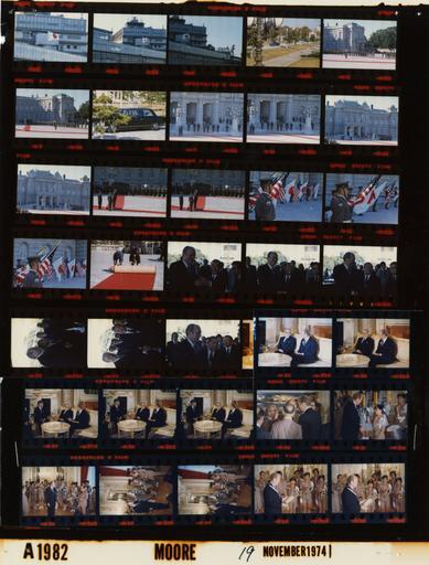 | Keywords: Ford A1982 NLGRF photo contact sheet (1974-11-18)(Gerald Ford Library).jpg White House Photographic Office WHPO is housed at the Gerald R Ford Presidential Library a branch of the National Archives and Records Administration NARA <br/><br/> This file is a 200 dpi photo contact sheet having images from roll of film A1982 of the August 9 1974 - January 20 1977 Gerald R Ford White House Photographic Office Series A0001-A9999 and B0001-B2886 photographs <br/><br/> The date on the photo contact sheet is the date the roll of film was processed not necessarily the date the photographs were taken See table below for additional details 1974-11-18 Gerald R Ford Presidential Library Image http //www fordlibrarymuseum gov/library/whphotos/A1982_NLGRF jpg A1982_NLGRF jpg from http //www fordlibrarymuseum gov/library/whphotos/19741118whpo pdf White House Photographs November 18 1974 of the http //www fordlibrarymuseum gov/Library/whphotos/whpo asp White House Photographic Collection page White House Photographic Office WHPO - Moore PD-USGov Institution Institution Gerald R Ford Presidential Library Table wikitable sortable + Photo contact sheet A1982 U S President Ford Administration Gerald R Ford Library Frame s Tone Subject proper Subject generic Names Geographic Location Photographer Date - 2-4 Color Trip to Japan - 1st Visit to Japan by Sitting U S President - Local Time Control Tower and Terminal Tokyo Japan Tokyo International Airport Moore 1974-11-18 - 5 Color Trip to Japan - 1st Visit to Japan by Sitting U S President - Local Time Car entering Palace grounds - long shot Tokyo Japan Akasaka Palace - Entrance Drive Moore 1974-11-18 - 6-7 Color Trip to Japan - 1st Visit to Japan by Sitting U S President - Prior to Arrival Ceremony - Local Time marching into position - long shots Honor Guard Color Guard Military Band Tokyo Japan Akasaka Palace - Outside Moore 1974-11-19 - 8 Color Trip to Japan - 1st Visit to Japan by Sitting U S President - Arrival of Emperor Hirohito Prior to Arrival Ceremony - Local Time Limousine entering Palace grounds - long shot Tokyo Japan Akasaka Palace - Entrance Drive Moore 1974-11-19 - 9-12 Color Trip to Japan - 1st Visit to Japan by Sitting U S President - Arrival Ceremony -Emperor of Japan - Local Time standing for anthems - morning coats; formal wear; long shots GRF Hirohito Japanese Officials Tokyo Japan Akasaka Palace - Outside Moore 1974-11-19 - 13-14 Color Trip to Japan - 1st Visit to Japan by Sitting U S President - Arrival Ceremony -U S Ambassador to Japan; Chief of Protocol - Local Time standing on platform in center of courtyard; looking towards Honor Guard - long shots; formal wear GRF Amb James Hodgson Amb Hiroshi Ushida Tokyo Japan Akasaka Palace - Outside Moore 1974-11-19 - 15-17 Color Trip to Japan - 1st Visit to Japan by Sitting U S President - Arrival Ceremony - Local Time standing near palace; holding alternating American and Japanese flags Military Tokyo Japan Akasaka Palace - Outside Moore 1974-11-19 - 18 Color Trip to Japan - 1st Visit to Japan by Sitting U S President - Following Arrival Ceremony - Local Time rolling up red carpets Maintenance Crew Tokyo Japan Akasaka Palace - Outside Moore 1974-11-19 - 19-24 Color Trip to Japan - 1st Visit to Japan by Sitting U S President - Prior to Face to Face Meeting with Japanese Prime Minister - Local Time greeting handshaking talking GRF Kakuei Tanaka Tokyo Japan Prime Minister's Residence - Outside Moore 1974-11-19 - 25-29 Color Trip to Japan - 1st Visit to Japan by Sitting U S President - Governor of Tokyo - Local Time seated talking near fireplace GRF Gov Minobe Translator Tokyo Japan Akasaka Palace - Second Floor Salon Moore 1974-11-19 - 30 Color Trip to Japan - 1st Visit to Japan by Sitting U S President - Local Time standing talking - backs to camera GRF Others Tokyo Japan Akasaka Palace Moore 1974-11-19 - 31-36 Color Trip to Japan - 1st Visit to Japan by Sitting U S President - Presentation of Award by Japanese Boy Scouts - Local Time GRF wearing neckerchief; holding framed gift - all not in every frame GRF Boy Scouts Tokyo Japan Akasaka Palace - Cocktail Lounge Moore 1974-11-19 Gerald R Ford Presidential Library and Museum-cooperation PD-USGov Contact sheets by the Ford White House November 1974 |