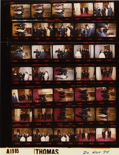 | Keywords: Ford A1985 NLGRF photo contact sheet (1974-11-20)(Gerald Ford Library).jpg White House Photographic Office WHPO is housed at the Gerald R Ford Presidential Library a branch of the National Archives and Records Administration NARA <br/><br/> This file is a 200 dpi photo contact sheet having images from roll of film A1985 of the August 9 1974 - January 20 1977 Gerald R Ford White House Photographic Office Series A0001-A9999 and B0001-B2886 photographs <br/><br/> The date on the photo contact sheet is the date the roll of film was processed not necessarily the date the photographs were taken See table below for additional details 1974-11-20 Gerald R Ford Presidential Library Image http //www fordlibrarymuseum gov/library/whphotos/A1985_NLGRF jpg A1985_NLGRF jpg from http //www fordlibrarymuseum gov/library/whphotos/19741120whpo pdf White House Photographs November 20 1974 of the http //www fordlibrarymuseum gov/Library/whphotos/whpo asp White House Photographic Collection page White House Photographic Office WHPO - Thomas PD-USGov Institution Institution Gerald R Ford Presidential Library Table wikitable sortable + Photo contact sheet A1985 U S President Ford Administration Gerald R Ford Library Frame s Tone Subject proper Subject generic Names Geographic Location Photographer Date - 3-5 Color Trip to Japan - 1st Visit to Japan by Sitting U S President - Reciprocal Reception - Local Time greeting handshaking GRF Japanese Wives Tokyo Japan Akasaka Palace Thomas 1974-11-20 - 6 Color Trip to Japan - 1st Visit to Japan by Sitting U S President - Reciprocal Reception - Crown Prince and Princess - Local Time entering room Amb Catto; Prince Akihito Princess Mikasa Tokyo Japan Akasaka Palace Thomas 1974-11-20 - 7-8 Color Trip to Japan - 1st Visit to Japan by Sitting U S President - Reciprocal Reception - Crown Prince and Princess; U S Ambassador to Japan - Local Time greeting handshaking Amb Catto; Prince Akihito Princess Mikasa Amb James Hodgson Tokyo Japan Akasaka Palace Thomas 1974-11-20 - 9-10 Color Trip to Japan - 1st Visit to Japan by Sitting U S President - Reciprocal Reception - Crown Prince and Princess - Local Time greeting handshaking Amb Catto; Prince Akihito Princess Mikasa Rumsfeld Tokyo Japan Akasaka Palace Thomas 1974-11-20 - 11-13 Color Trip to Japan - 1st Visit to Japan by Sitting U S President - Reciprocal Reception - Crown Prince and Princess - Local Time greeting handshaking GRF Amb Catto; Prince Akihito Princess Mikasa Tokyo Japan Akasaka Palace Thomas 1974-11-20 - 14-15 Color Trip to Japan - 1st Visit to Japan by Sitting U S President - Reciprocal Reception - Arrival of Emperor of Japan - Local Time greeting handshaking guard saluting in background GRF Hirohito; Marine Guard Tokyo Japan Akasaka Palace Thomas 1974-11-20 - 16-20 Color Trip to Japan - 1st Visit to Japan by Sitting U S President - Reciprocal Reception - Emperor and Empress of Japan - Local Time greeting handshaking guard saluting in background GRF Hirohito Empress Nagako; Marine Guard Tokyo Japan Akasaka Palace Thomas 1974-11-20 - 21-31 Color Trip to Japan - 1st Visit to Japan by Sitting U S President - Reciprocal Reception - Emperor of Japan - Local Time walking through palace talking GRF Hirohito Tokyo Japan Akasaka Palace Thomas 1974-11-20 - 32-35 Color Trip to Japan - 1st Visit to Japan by Sitting U S President - Reciprocal Reception - Emperor and Empress; Crown Prince and Princess of Japan - Local Time standing talking - all not in every frame GRF Hirohito Empress Nagako; Prince Akihito Princess Mikasa Kissinger Others Tokyo Japan Akasaka Palace Thomas 1974-11-20 - 36-37 Color Trip to Japan - 1st Visit to Japan by Sitting U S President - Reciprocal Reception - Crown Prince and Princess - Local Time walking through palace talking Prince Akihito Princess Mikasa Kissinger Others Tokyo Japan Akasaka Palace Thomas 1974-11-20 Gerald R Ford Presidential Library and Museum-cooperation PD-USGov Contact sheets by the Ford White House November 1974 |