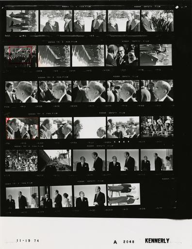Keywords: Ford A2048 NLGRF photo contact sheet (1974-11-19)(Gerald Ford Library).jpg White House Photographic Office WHPO is housed at the Gerald R Ford Presidential Library a branch of the National Archives and Records Administration NARA <br/><br/> This file is a 200 dpi photo contact sheet having images from roll of film A2048 of the August 9 1974 - January 20 1977 Gerald R Ford White House Photographic Office Series A0001-A9999 and B0001-B2886 photographs <br/><br/> The date on the photo contact sheet is the date the roll of film was processed not necessarily the date the photographs were taken See table below for additional details 1974-11-19 Gerald R Ford Presidential Library Image http //www fordlibrarymuseum gov/library/whphotos/A2048_NLGRF jpg A2048_NLGRF jpg from http //www fordlibrarymuseum gov/library/whphotos/19741119whpo pdf White House Photographs November 19 1974 of the http //www fordlibrarymuseum gov/Library/whphotos/whpo asp White House Photographic Collection page White House Photographic Office WHPO <br/> Creator David Hume Kennerly PD-USGov Institution Institution Gerald R Ford Presidential Library Table wikitable sortable + Photo contact sheet A2048 U S President Ford Administration Gerald R Ford Library Frame s Tone Subject proper Subject generic Names Geographic Location Photographer Date - 3 BW Trip to Japan - 1st Visit to Japan by Sitting U S President - Arrival Ceremony -U S Ambassador to Japan - Local Time returning to starting point following inspection of Honor Guard; formal wear GRF Amb James Hodgson Tokyo Japan Akasaka Palace Kennerly 1974-11-19 - 4-6 BW Trip to Japan - 1st Visit to Japan by Sitting U S President - Arrival Ceremony with Emperor of Japan - Local Time greeting handshaking; formal wear GRF Hirohito Kissinger Tokyo Japan Akasaka Palace Kennerly 1974-11-19 - 7-10 BW Trip to Japan - 1st Visit to Japan by Sitting U S President - Arrival Ceremony - Local Time greeting handshaking; formal wear GRF Japanese Officials Tokyo Japan Akasaka Palace Kennerly 1974-11-19 - 11 BW Trip to Japan - 1st Visit to Japan by Sitting U S President - Arrival Ceremony - Local Time greeting handshaking; formal wear GRF Unidentified Men Tokyo Japan Akasaka Palace Kennerly 1974-11-19 - 12-17 BW Trip to Japan - 1st Visit to Japan by Sitting U S President - Arrival Ceremony -Emperor of Japan - Local Time standing -informal portrait s ; formal wear Hirohito Tokyo Japan Akasaka Palace Kennerly 1974-11-19 - 18-21 BW Trip to Japan - 1st Visit to Japan by Sitting U S President - Arrival Ceremony -Emperor of Japan - Local Time standing talking - interpreter not in every frame; formal wear GRF Hirohito Interpreter Tokyo Japan Akasaka Palace Kennerly 1974-11-19 - 22-23 BW Trip to Japan - 1st Visit to Japan by Sitting U S President - Motorcade to Imperial Palace - Local Time waving flags clapping; formal wear Crowd Tokyo Japan Street Scene Kennerly 1974-11-19 - 24 BW Trip to Japan - 1st Visit to Japan by Sitting U S President - Motorcade to Imperial Palace - Local Time driving up incline limousines Tokyo Japan Street Scene Kennerly 1974-11-19 - 25-26 BW Trip to Japan - 1st Visit to Japan by Sitting U S President - Visit to Imperial Palace - Emperor of Japan - Local Time standing posing smiling; formal wear GRF Hirohito Tokyo Japan Imperial Palace - Takeno-ma Kennerly 1974-11-19 - 27-29 BW Trip to Japan - 1st Visit to Japan by Sitting U S President - Visit to Imperial Palace - Emperor and Empress of Japan - Local Time standing posing smiling; formal wear GRF Hirohito Nagako Tokyo Japan Imperial Palace - Takeno-ma Kennerly 1974-11-19 - 30-31 BW Trip to Japan - 1st Visit to Japan by Sitting U S President - Visit to Imperial Palace - Emperor and Empress of Japan - Local Time standing posing; formal wear; formal wear GRF Hirohito Tokyo Japan Imperial Palace - Takeno-ma Kennerly 1974-11-19 Gerald R Ford Presidential Library and Museum-cooperation PD-USGov Contact sheets by the Ford White House November 1974 Photographs by David Hume Kennerly from 1974 |