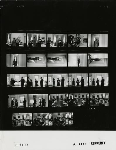 | Keywords: Ford A2223 NLGRF photo contact sheet (1974-11-30)(Gerald Ford Library).jpg White House Photographic Office WHPO is housed at the Gerald R Ford Presidential Library a branch of the National Archives and Records Administration NARA <br/><br/> This file is a 200 dpi photo contact sheet having images from roll of film A2223 of the August 9 1974 - January 20 1977 Gerald R Ford White House Photographic Office Series A0001-A9999 and B0001-B2886 photographs <br/><br/> The date on the photo contact sheet is the date the roll of film was processed not necessarily the date the photographs were taken See table below for additional details 1974-11-30 Gerald R Ford Presidential Library Image http //www fordlibrarymuseum gov/library/whphotos/A2223_NLGRF jpg A2223_NLGRF jpg from http //www fordlibrarymuseum gov/library/whphotos/19741130whpo pdf White House Photographs November 30 1974 of the http //www fordlibrarymuseum gov/Library/whphotos/whpo asp White House Photographic Collection page White House Photographic Office WHPO <br/> Creator David Hume Kennerly PD-USGov Institution Institution Gerald R Ford Presidential Library Table wikitable sortable + Photo contact sheet A2223 U S President Ford Administration Gerald R Ford Library Frame s Tone Subject proper Subject generic Names Geographic Location Photographer Date - 5 BW U S Senator from Louisiana LA sitting talking near fireplace GRF Sen Long Oval Office Kennerly 1974-11-30 - 17-18 BW Farewell Handshake - Confidential Assistant Counsellor to the President standing talking handshaking walking toward doorway GRF Jennifer Fitzgerald Burch Oval Office Kennerly 1974-11-30 - 2-3 BW U S Senator from Louisiana LA standing talking GRF Sen Long Oval Office Kennerly 1974-11-30 - 4 BW U S Senator from Louisiana LA standing talking laughing GRF Sen Long Korologos Oval Office Kennerly 1974-11-30 - 6 BW U S Senator from Louisiana LA standing in doorway to Scheduling and Advance Office GRF Sen Long Korologos Oval Office Kennerly 1974-11-30 - 7-11 BW standing in doorway to Scheduling and Advance Office GRF Korologos Oval Office Kennerly 1974-11-30 - 12-16 BW Farewell Handshake - Confidential Assistant Counsellor to the President standing talking handshaking; Burch appears in frame 13 GRF Jennifer Fitzgerald Oval Office Kennerly 1974-11-30 - 19-24 BW Meeting to Discuss General Revenue Sharing seated around table; all may not be in every frame GRF Simon O'Neill Greenspan Schmults Watt Seidman Marsh Hartmann Timmons Cole Falk Scott Cabinet Room Kennerly 1974-11-30 Gerald R Ford Presidential Library and Museum-cooperation PD-USGov Contact sheets by the Ford White House November 1974 Photographs by David Hume Kennerly from 1974 |