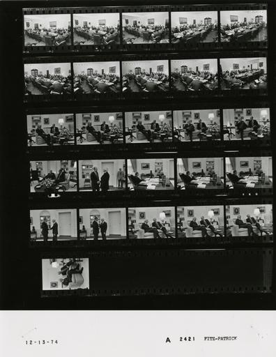 | Keywords: Ford A2421 NLGRF photo contact sheet (1974-12-13)(Gerald Ford Library).jpg White House Photographic Office WHPO is housed at the Gerald R Ford Presidential Library a branch of the National Archives and Records Administration NARA <br/><br/> This file is a 200 dpi photo contact sheet having images from roll of film A2421 of the August 9 1974 - January 20 1977 Gerald R Ford White House Photographic Office Series A0001-A9999 and B0001-B2886 photographs <br/><br/> The date on the photo contact sheet is the date the roll of film was processed not necessarily the date the photographs were taken See table below for additional details 1974-12-13 Gerald R Ford Presidential Library Image http //www fordlibrarymuseum gov/library/whphotos/A2421_NLGRF jpg A2421_NLGRF jpg from http //www fordlibrarymuseum gov/library/whphotos/19741213whpo pdf White House Photographs December 13 1974 of the http //www fordlibrarymuseum gov/Library/whphotos/whpo asp White House Photographic Collection page White House Photographic Office WHPO - Fitz-Patrick PD-USGov Institution Institution Gerald R Ford Presidential Library Table wikitable sortable + Photo contact sheet A2421 U S President Ford Administration Gerald R Ford Library Frame s Tone Subject proper Subject generic Names Geographic Location Photographer Date - 2-11 BW Meeting with the National Commission on Productivity And Work Quality seated around table; various angles and distances; all not in every frame GRF W Abel Ash F Barnett Brennan D Burnham B Burrell C Cleary C L Dennis Dent Dunlop Greenspan W Horvitz R Larry J Lyon W McClennan J O'Connell A Rees J Rosow C Schultz Seidman Simon R Ryan M Weiner N Weintraub Others Roosevelt Room Fitz-Patrick 1974-12-13 - 12-14 BW Congressional Hour - Meeting to Discuss Salt II - U S Senator from Arizona AZ seated on sofa near fireplace GRF Sen Goldwater Oval Office Fitz-Patrick 1974-12-13 - 15-17 BW Congressional Hour - Meeting to Discuss the Economic Situation - U S Representative from New Jersey NJ seated on sofa near fireplace GRF Rep Widnall Oval Office Fitz-Patrick 1974-12-13 - 18 BW Congressional Hour - Meeting to Discuss Job Possibilities - U S Representative from Indiana IN greeting handshaking GRF Rep Bray Oval Office Fitz-Patrick 1974-12-13 - 19-21 BW Congressional Hour - Meeting to Discuss Job Possibilities - U S Representative from Indiana IN seated around desk GRF Rep Bray Friedersdorf Oval Office Fitz-Patrick 1974-12-13 - 22-23 BW Congressional Hour - Meeting to Discuss Salt II - U S Senator from Virginia VA greeting handshaking GRF Sen Byrd Oval Office Fitz-Patrick 1974-12-13 - 24-27 BW Congressional Hour - Meeting to Discuss Salt II - U S Senator from Virginia VA seated on sofa near fireplace GRF Sen Byrd Oval Office Fitz-Patrick 1974-12-13 Gerald R Ford Presidential Library and Museum-cooperation PD-USGov Contact sheets by the Ford White House December 1974 |