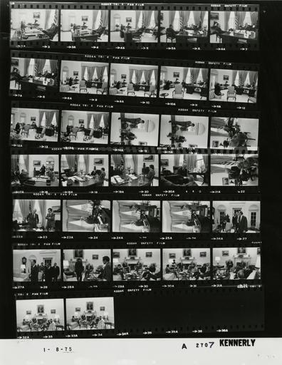 | Keywords: Ford A2707 NLGRF photo contact sheet (1975-01-08)(Gerald Ford Library).jpg White House Photographic Office WHPO is housed at the Gerald R Ford Presidential Library a branch of the National Archives and Records Administration NARA <br/><br/> This file is a 200 dpi photo contact sheet having images from roll of film A2707 of the August 9 1974 - January 20 1977 Gerald R Ford White House Photographic Office Series A0001-A9999 and B0001-B2886 photographs <br/><br/> The date on the photo contact sheet is the date the roll of film was processed not necessarily the date the photographs were taken See table below for additional details 1975-01-08 Gerald R Ford Presidential Library Image http //www fordlibrarymuseum gov/library/whphotos/A2707_NLGRF jpg A2707_NLGRF jpg from http //www fordlibrarymuseum gov/library/whphotos/19750108whpo pdf White House Photographs January 8 1975 of the http //www fordlibrarymuseum gov/Library/whphotos/whpo asp White House Photographic Collection page White House Photographic Office WHPO <br/> Creator David Hume Kennerly PD-USGov Institution Institution Gerald R Ford Presidential Library Table wikitable sortable + Photo contact sheet A2707 U S President Ford Administration Gerald R Ford Library Frame s Tone Subject proper Subject generic Names Geographic Location Photographer Date - 3-14 BW Time Photographer seated around desk talking - various angles and distances; Eddy Adams taking photos in last six frames GRF Orben Oval Office Kennerly 1975-01-08 - 15-16 BW Video Tape Recorder Operator WHCA and Trainer of Liberty; Pet Golden Retriever Brockett standing near exterior door; GRF stooping petting dog GRF Bill Brockett Liberty Oval Office Kennerly 1975-01-08 - 17-20 BW Video Tape Recorder Operator WHCA and Trainer of Liberty; Time Photographer; Pet Golden Retriever GRF and Brockett seated around desk dog nearby; Adams taking photographs various angles and distances; Brockett and Adams not in all frames GRF Bill Brockett Eddy Adams Liberty Oval Office Kennerly 1975-01-08 - 21-22 BW Pet Golden Retriever GRF seated at desk petting dog smiling GRF Liberty Oval Office Kennerly 1975-01-08 - 23-26 BW Video Tape Recorder Operator WHCA and Trainer of Liberty; Pet Golden Retriever GRF seated at edge of desk talking; dog nearby; Brockett not in second frame GRF Bill Brockett Liberty Oval Office Kennerly 1975-01-08 - 27-29 BW Meeting to Discuss US-China Relations; US Senator from Montana MT greeting handshaking standing talking walking toward fireplace - all not in every frame GRF Kissinger Rockefeller Sen Mansfield Rumsfeld Marsh Oval Office Kennerly 1975-01-08 - 30-34 BW Meeting to Discuss US-China Relations; US Senator from Montana MT seated near fireplace talking - various angles GRF Kissinger Rockefeller Sen Mansfield Rumsfeld Marsh Oval Office Kennerly 1975-01-08 Gerald R Ford Presidential Library and Museum-cooperation PD-USGov Contact sheets by the Ford White House January 1975 Photographs by David Hume Kennerly from 1975 |