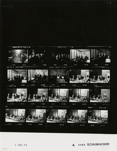 | Keywords: Ford A2928 NLGRF photo contact sheet (1975-01-25)(Gerald Ford Library).jpg White House Photographic Office WHPO is housed at the Gerald R Ford Presidential Library a branch of the National Archives and Records Administration NARA <br/><br/> This file is a 200 dpi photo contact sheet having images from roll of film A2928 of the August 9 1974 - January 20 1977 Gerald R Ford White House Photographic Office Series A0001-A9999 and B0001-B2886 photographs <br/><br/> The date on the photo contact sheet is the date the roll of film was processed not necessarily the date the photographs were taken See table below for additional details 1975-01-25 Gerald R Ford Presidential Library Image http //www fordlibrarymuseum gov/library/whphotos/A2928_NLGRF jpg A2928_NLGRF jpg from http //www fordlibrarymuseum gov/library/whphotos/19750125whpo pdf White House Photographs January 25 1975 of the http //www fordlibrarymuseum gov/Library/whphotos/whpo asp White House Photographic Collection page White House Photographic Office WHPO - Schumacher PD-USGov Institution Institution Gerald R Ford Presidential Library Table wikitable sortable + Photo contact sheet A2928 U S President Ford Administration Gerald R Ford Library Frame s Tone Subject proper Subject generic Names Geographic Location Photographer Date - 4-6 BW Arrival for Speech at Alfalfa Club Dinner - Chairman Executive Committee; Chairman Dinner Committee; Hotel General Manager greeting handshaking formal wear; all not in every frame GRF Thomas Mackinaw William Bell Joseph Frederick Washington DC Statler Hilton Hotel - Outside Schumacher 1975-01-25 - 7-11 BW Arrival for Alfalfa Club Dinner - U S Senator from Minnesota MN and President Alfalfa Club; Vice President Eastern Airlines and Former President of Alfalfa Club standing talking posing - formal wear wearing medallions GRF Hubert Humphrey Frank Barman Washington DC Statler Hilton Hotel - Holding Room Schumacher 1975-01-25 - 12-23 BW Alfalfa Club Dinner - U S Senator from Minnesota MN and President Alfalfa Club; Chief Justice U S Supreme Court seated at head table laughing - all not in every frame formal wear GRF Hubert Humphrey Warren Burger Others Washington DC Statler Hilton Hotel Schumacher 1975-01-25 Gerald R Ford Presidential Library and Museum-cooperation PD-USGov Contact sheets by the Ford White House January 1975 |