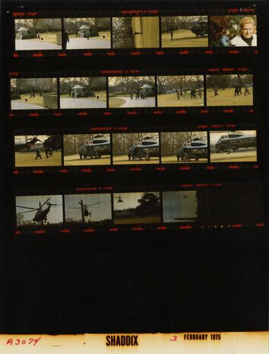 | Keywords: Ford A3074 NLGRF photo contact sheet (1975-02-03)(Gerald Ford Library).jpg White House Photographic Office WHPO is housed at the Gerald R Ford Presidential Library a branch of the National Archives and Records Administration NARA <br/><br/> This file is a 200 dpi photo contact sheet having images from roll of film A3074 of the August 9 1974 - January 20 1977 Gerald R Ford White House Photographic Office Series A0001-A9999 and B0001-B2886 photographs <br/><br/> The date on the photo contact sheet is the date the roll of film was processed not necessarily the date the photographs were taken See table below for additional details 1975-02-03 Gerald R Ford Presidential Library Image http //www fordlibrarymuseum gov/library/whphotos/A3074_NLGRF jpg A3074_NLGRF jpg from http //www fordlibrarymuseum gov/library/whphotos/19750203whpo pdf White House Photographs February 3 1975 of the http //www fordlibrarymuseum gov/Library/whphotos/whpo asp White House Photographic Collection page White House Photographic Office WHPO - Shaddix PD-USGov Institution Institution Gerald R Ford Presidential Library Table wikitable sortable + Photo contact sheet A3074 U S President Ford Administration Gerald R Ford Library Frame s Tone Subject proper Subject generic Names Geographic Location Photographer Date - 2A-12A Color Prior to Departure for Flight to Atlanta Georgia walking toward helicopter; Guard shack in some frames; helicopter in frame 12A GRF Others South Lawn Shaddix 1975-02-03 - 13A-20A Color Departure for Andrews Air Force Base Prior to Flight to Atlanta Georgia entering Marine One; Helicopter ascending; Washington Monument in some frames GRF Others South Lawn Shaddix 1975-02-03 Gerald R Ford Presidential Library and Museum-cooperation PD-USGov Contact sheets by the Ford White House February 1975 |