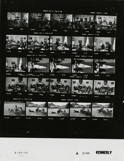 | Keywords: Ford A3155 NLGRF photo contact sheet (1975-02-07)(Gerald Ford Library).jpg White House Photographic Office WHPO is housed at the Gerald R Ford Presidential Library a branch of the National Archives and Records Administration NARA <br/><br/> This file is a 200 dpi photo contact sheet having images from roll of film A3155 of the August 9 1974 - January 20 1977 Gerald R Ford White House Photographic Office Series A0001-A9999 and B0001-B2886 photographs <br/><br/> The date on the photo contact sheet is the date the roll of film was processed not necessarily the date the photographs were taken See table below for additional details 1975-02-07 Gerald R Ford Presidential Library Image http //www fordlibrarymuseum gov/library/whphotos/A3155_NLGRF jpg A3155_NLGRF jpg from http //www fordlibrarymuseum gov/library/whphotos/19750207whpo pdf White House Photographs February 7 1975 of the http //www fordlibrarymuseum gov/Library/whphotos/whpo asp White House Photographic Collection page White House Photographic Office WHPO <br/> Creator David Hume Kennerly PD-USGov Institution Institution Gerald R Ford Presidential Library Table wikitable sortable + Photo contact sheet A3155 U S President Ford Administration Gerald R Ford Library Frame s Tone Subject proper Subject generic Names Geographic Location Photographer Date - 3-5 BW standing talking; taken from inside Oval Office GRF Keiser Sidewalk Between Oval Office and South Driveway Kennerly 1975-02-07 - 6 BW Meeting to Discuss Energy Program seated around table; all not in frame GRF Porter Seidman Marsh Zarb Morton Greenspan Others Cabinet Room Kennerly 1975-02-07 - 10-17 BW Prior to Receiving Shultz Report on recent Energy Meeting in Germany and Shah Meeting in Switzerland moving around room GRF Kissinger Oval Office Kennerly 1975-02-07 - 18-22 BW Receive Shultz Report on recent Energy Meeting in Germany and Shah Meeting in Switzerland; Bechtel V P Shultz; UnderSecState Econ Affairs Robinson GRF Shultz seated in chairs by fireplace others on sofas GRF George Shultz Charles Robinson Kissinger Scowcroft Oval Office Kennerly 1975-02-07 - 23-27 BW Birthday Party for Pet Golden Retriever dogs playing on lawn; White House and Old Executive Office Building OEOB in background Susan Ford Liberty Other Dogs South Lawn Kennerly 1975-02-07 - 7-9 BW Meeting to Discuss Unemployment seated around desk all not in every frame; various angles and distances GRF Nessen Hartmann Cavanaugh Lynn O'Neill Marsh Friedersdorf Rumsfeld Greenspan Cheney Oval Office Kennerly 1975-02-07 Gerald R Ford Presidential Library and Museum-cooperation PD-USGov Contact sheets by the Ford White House February 1975 Photographs by David Hume Kennerly from 1975 |