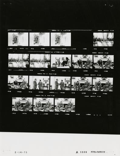 | Keywords: Ford A3306 NLGRF photo contact sheet (1975-02-14)(Gerald Ford Library).jpg White House Photographic Office WHPO is housed at the Gerald R Ford Presidential Library a branch of the National Archives and Records Administration NARA <br/><br/> This file is a 200 dpi photo contact sheet having images from roll of film A3306 of the August 9 1974 - January 20 1977 Gerald R Ford White House Photographic Office Series A0001-A9999 and B0001-B2886 photographs <br/><br/> The date on the photo contact sheet is the date the roll of film was processed not necessarily the date the photographs were taken See table below for additional details 1975-02-14 Gerald R Ford Presidential Library Image http //www fordlibrarymuseum gov/library/whphotos/A3306_NLGRF jpg A3306_NLGRF jpg from http //www fordlibrarymuseum gov/library/whphotos/19750214whpo pdf White House Photographs February 14 1975 of the http //www fordlibrarymuseum gov/Library/whphotos/whpo asp White House Photographic Collection page White House Photographic Office WHPO - Schumacher PD-USGov Institution Institution Gerald R Ford Presidential Library Table wikitable sortable + Photo contact sheet A3306 U S President Ford Administration Gerald R Ford Library Frame s Tone Subject proper Subject generic Names Geographic Location Photographer Date - 2A-4A BW standing posing; White House in background Unidentified Group South Lawn Schumacher 1975-02-14 - 5A BW Schumacher 1975-02-14 - 6A-8A BW Meeting with Higher Education Association Representatives seated at table; GRF smoking pipe; all not in frames GRF Higher Education Association Representatives Cabinet Room Schumacher 1975-02-14 - 9A BW Meeting to Discuss Relations with Federal Republic of Germany FRG ; Member of the Bundestag and Economic Spokesman for the FRG Ambassador from the FRG to the US greeting handshaking GRF Otto Lamnsdorff Amb Gerndt von Staden Scowcroft Oval Office Schumacher 1975-02-14 - 13A-14A BW Mayor of Providence Rhode Island greeting handshaking talking GRF Mayor Vincent Cianci Oval Office Schumacher 1975-02-14 - 10A-12A BW Meeting to Discuss Relations with Federal Republic of Germany FRG ; Member of the Bundestag and Economic Spokesman for the FRG seated talking near fireplace GRF Otto Lamnsdorff Oval Office Schumacher 1975-02-14 - 15A-19A BW Mayor of Providence Rhode Island seated talking near fireplace GRF Mayor Vincent Cianci Oval Office Schumacher 1975-02-14 Gerald R Ford Presidential Library and Museum-cooperation PD-USGov Contact sheets by the Ford White House February 1975 |