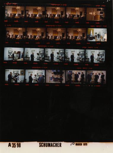 | Keywords: Ford A3598 NLGRF photo contact sheet (1975-03-10)(Gerald Ford Library).jpg White House Photographic Office WHPO is housed at the Gerald R Ford Presidential Library a branch of the National Archives and Records Administration NARA <br/><br/> This file is a 200 dpi photo contact sheet having images from roll of film A3598 of the August 9 1974 - January 20 1977 Gerald R Ford White House Photographic Office Series A0001-A9999 and B0001-B2886 photographs <br/><br/> The date on the photo contact sheet is the date the roll of film was processed not necessarily the date the photographs were taken See table below for additional details 1975-03-10 Gerald R Ford Presidential Library Image http //www fordlibrarymuseum gov/library/whphotos/A3598_NLGRF jpg A3598_NLGRF jpg from http //www fordlibrarymuseum gov/library/whphotos/19750310whpo pdf White House Photographs March 10 1975 of the http //www fordlibrarymuseum gov/Library/whphotos/whpo asp White House Photographic Collection page White House Photographic Office WHPO - Schumacher PD-USGov Institution Institution Gerald R Ford Presidential Library Table wikitable sortable + Photo contact sheet A3598 U S President Ford Administration Gerald R Ford Library Frame s Tone Subject proper Subject generic Names Geographic Location Photographer Date - 2A-10A Color Swearing in of Secretary of Housing and Urban Development Carla Hills at lectern speaking; others behin;long shots GRF Carla Hills Roderick Hills Sr ; Alison Laura Megan Rick Hills; Justice Byron White Rockefeller Others East Room Schumacher 1975-03-10 - 11A Color entering room GRF Oval Office Schumacher 1975-03-10 - 10A-21A Color Miss America 1975 Entourage all not in every frame GRF Shirley Cothran Joseph Bradway Rep Ray Roberts Doris Kelly Oval Office Schumacher 1975-03-10 Gerald R Ford Presidential Library and Museum-cooperation PD-USGov Contact sheets by the Ford White House March 1975 |