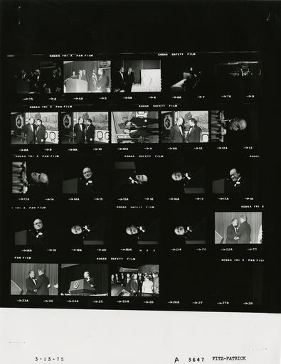 | Keywords: Ford A3647 NLGRF photo contact sheet (1975-03-13)(Gerald Ford Library).jpg White House Photographic Office WHPO is housed at the Gerald R Ford Presidential Library a branch of the National Archives and Records Administration NARA <br/><br/> This file is a 200 dpi photo contact sheet having images from roll of film A3647 of the August 9 1974 - January 20 1977 Gerald R Ford White House Photographic Office Series A0001-A9999 and B0001-B2886 photographs <br/><br/> The date on the photo contact sheet is the date the roll of film was processed not necessarily the date the photographs were taken See table below for additional details 1975-03-13 Gerald R Ford Presidential Library Image http //www fordlibrarymuseum gov/library/whphotos/A3647_NLGRF jpg A3647_NLGRF jpg from http //www fordlibrarymuseum gov/library/whphotos/19750313whpo pdf White House Photographs March 13 1975 of the http //www fordlibrarymuseum gov/Library/whphotos/whpo asp White House Photographic Collection page White House Photographic Office WHPO - Fitz-Patrick PD-USGov Institution Institution Gerald R Ford Presidential Library Table wikitable sortable + Photo contact sheet A3647 U S President Ford Administration Gerald R Ford Library Frame s Tone Subject proper Subject generic Names Geographic Location Photographer Date - 3A-7A BW Labor-Industry Banquet; First Issue Collective Bargaining Stamp; Unveil Bargaining Sculpture - Pres Continental Can Co ; Postmaster General; Chair Dir and Pres Inst of Collective Bargaining; Pres Int Assoc of Machinists; Dir Med And Concilia GRF remarks at podium introduction by Kheel commemorative stamp hanging in rear; GRF and Usery viewing sculpture by Segal in 5A; GRF in formal wear; all not in every frame; various distances; GRF Robert Hatfield Benjamin Bailar Ted Klassen Theodore Kheel William Winpisinger Floyd Smith William Usery Washington DC Statler Hilton Hotel - Congressional Room Fitz-Patrick 1975-03-13 - 8A-11A BW Prior to 31st Annual Radio and Television Correspondents Dinner standing talking; formal wear GRF J F D'Angelo Washington DC Washington Hilton Hotel Fitz-Patrick 1975-03-13 - 12A-21A BW 31st Annual Radio and Television Correspondents Dinner - American Comedian and Actor at podium in last eight frames; formal wear Bob Hope Washington DC Washington Hilton Hotel - International Ballroom Fitz-Patrick 1975-03-13 - 22A-23A BW 31st Annual Radio and Television Correspondents Dinner - American Comedian and Actor handshaking; formal wear GRF Bob Hope Washington DC Washington Hilton Hotel - International Ballroom Fitz-Patrick 1975-03-13 - 24A BW 31st Annual Radio and Television Correspondents Dinner at podium; formal wear GRF Washington DC Washington Hilton Hotel - International Ballroom Fitz-Patrick 1975-03-13 - 25A BW Following 31st Annual Radio and Television Correspondents Dinner GRF entering limousine; formal wear GRF Secret Service Washington DC Outside the Washington Hilton Hotel Fitz-Patrick 1975-03-13 Gerald R Ford Presidential Library and Museum-cooperation PD-USGov Contact sheets by the Ford White House March 1975 |