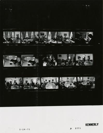 | Keywords: Ford A3771 NLGRF photo contact sheet (1975-03-24)(Gerald Ford Library).jpg White House Photographic Office WHPO is housed at the Gerald R Ford Presidential Library a branch of the National Archives and Records Administration NARA <br/><br/> This file is a 200 dpi photo contact sheet having images from roll of film A3771 of the August 9 1974 - January 20 1977 Gerald R Ford White House Photographic Office Series A0001-A9999 and B0001-B2886 photographs <br/><br/> The date on the photo contact sheet is the date the roll of film was processed not necessarily the date the photographs were taken See table below for additional details 1975-03-24 Gerald R Ford Presidential Library Image http //www fordlibrarymuseum gov/library/whphotos/A3771_NLGRF jpg A3771_NLGRF jpg from http //www fordlibrarymuseum gov/library/whphotos/19750324whpo pdf White House Photographs March 24 1975 of the http //www fordlibrarymuseum gov/Library/whphotos/whpo asp White House Photographic Collection page White House Photographic Office WHPO <br/> Creator David Hume Kennerly PD-USGov Institution Institution Gerald R Ford Presidential Library Table wikitable sortable + Photo contact sheet A3771 U S President Ford Administration Gerald R Ford Library Frame s Tone Subject proper Subject generic Names Geographic Location Photographer Date - 2-5 BW moving around room; all not in every frame GRF Nessen Friedersdorf Marsh Hartmann Oval Office Kennerly 1975-03-24 - 6 BW Meeting with Romanian Choral Group sponsored by Friendship Ambassadors Inc all not in frame GRF Mr Mrs Harry Morgan Thomas Dunlop Amb Corneliu Bogdan Eugen Florescu Cyprian Porembescu Choral Group Crown of the Carpathians Folk Dance Ensemble; Others Cabinet Room Kennerly 1975-03-24 - 7-8 BW standing on telephone; back to camera Marsh Scheduling and Advance Office Kennerly 1975-03-24 - 9 BW Meeting with Romanian Choral Group sponsored by Friendship Ambassadors Inc all not in frame GRF Mr Mrs Harry Morgan Thomas Dunlop Amb Corneliu Bogdan Eugen Florescu Cyprian Porembescu Choral Group Crown of the Carpathians Folk Dance Ensemble; Others Cabinet Room Kennerly 1975-03-24 - 10 BW on sofa near fireplace GRF C Hills Oval Office Kennerly 1975-03-24 - 11-16 BW Meeting With Transition Team around table; various angles and distances; all not in every frame GRF John Byrnes William Scranton William Whyte Bryce Harlow Sen Griffin David Packard Marsh Hartmann Rumsfeld Buchen Seidman Cheney Cabinet Room Kennerly 1975-03-24 Gerald R Ford Presidential Library and Museum-cooperation PD-USGov Contact sheets by the Ford White House March 1975 Photographs by David Hume Kennerly from 1975 |