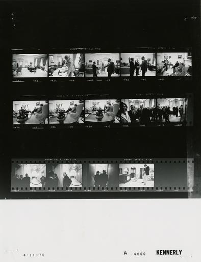 | Keywords: Ford A4000 NLGRF photo contact sheet (1975-04-10)(Gerald Ford Library).jpg White House Photographic Office WHPO is housed at the Gerald R Ford Presidential Library a branch of the National Archives and Records Administration NARA <br/><br/> This file is a 200 dpi photo contact sheet having images from roll of film A4000 of the August 9 1974 - January 20 1977 Gerald R Ford White House Photographic Office Series A0001-A9999 and B0001-B2886 photographs <br/><br/> The date on the photo contact sheet is the date the roll of film was processed not necessarily the date the photographs were taken See table below for additional details 1975-04-10 Gerald R Ford Presidential Library Image http //www fordlibrarymuseum gov/library/whphotos/A4000_NLGRF jpg A4000_NLGRF jpg from http //www fordlibrarymuseum gov/library/whphotos/19750410whpo pdf White House Photographs April 10 1975 of the http //www fordlibrarymuseum gov/Library/whphotos/whpo asp White House Photographic Collection page White House Photographic Office WHPO <br/> Creator David Hume Kennerly PD-USGov Institution Institution Gerald R Ford Presidential Library Table wikitable sortable + Photo contact sheet A4000 U S President Ford Administration Gerald R Ford Library Frame s Tone Subject proper Subject generic Names Geographic Location Photographer Date - 3 BW at desk smoking pipe; long shot GRF Oval Office Kennerly 1975-04-10 - 4 BW standing near desk GRF Hartmann Oval Office Kennerly 1975-04-10 - 5 BW greeting handshaking GRF Rep Albert Oval Office Kennerly 1975-04-10 - 6 BW greeting handshaking; Albert in background eyes closed GRF Rep Rhodes Oval Office Kennerly 1975-04-10 - 7-10 BW seated near fireplace; various distances GRF Reps Rhodes Albert Oval Office Kennerly 1975-04-10 - 11-12 BW Prior to State of the World Address greeting handshaking talking GRF Others Washington DC United States Capitol -Room H210 Kennerly 1975-04-10 - 13-15 BW Prior to State of the World Address walking to House Chamber GRF Escort Committee Washington DC United States Capitol -Hallway Kennerly 1975-04-10 - 16 BW Prior to Watching Tape of State of the World Address kneeling adjusting television; Jack standing nearby Betty Ford Jack Ford Second Floor - West Sitting Hall Kennerly 1975-04-10 Gerald R Ford Presidential Library and Museum-cooperation PD-USGov Contact sheets by the Ford White House April 1975 Photographs by David Hume Kennerly from 1975 |