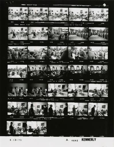| Keywords: Ford A4642 NLGRF photo contact sheet (1975-05-17)(Gerald Ford Library).jpg White House Photographic Office WHPO is housed at the Gerald R Ford Presidential Library a branch of the National Archives and Records Administration NARA <br/><br/> This file is a 200 dpi photo contact sheet having images from roll of film A4642 of the August 9 1974 - January 20 1977 Gerald R Ford White House Photographic Office Series A0001-A9999 and B0001-B2886 photographs <br/><br/> The date on the photo contact sheet is the date the roll of film was processed not necessarily the date the photographs were taken See table below for additional details 1975-05-17 Gerald R Ford Presidential Library Image http //www fordlibrarymuseum gov/library/whphotos/A4642_NLGRF jpg A4642_NLGRF jpg from http //www fordlibrarymuseum gov/library/whphotos/19750517whpo pdf White House Photographs May 17 1975 of the http //www fordlibrarymuseum gov/Library/whphotos/whpo asp White House Photographic Collection page White House Photographic Office WHPO <br/> Creator David Hume Kennerly PD-USGov Institution Institution Gerald R Ford Presidential Library Table wikitable sortable + Photo contact sheet A4642 U S President Ford Administration Gerald R Ford Library Frame s Tone Subject proper Subject generic Names Geographic Location Photographer Date - 17A-20A BW Meeting To Discuss Title IX seated around table; various angles; all not in frames GRF Weinberger Dunlop Lynn O'Neill Cannon Hills Marsh Bennett Greenspan Quern Chapman Roth Porter Parsons Rhinelander Holmes Gregory Lindh Hartmann Cabinet Room Kennerly 1975-05-17 - 21A-22A BW Steve Ford Birthday Party standing talking GRF Steve Ford Second Floor - West Sitting Room Kennerly 1975-05-17 - 23A-32A BW Steve Ford Birthday Party GRF standing in most frames; others seated; all not in every frame GRF Steve Ford Candice Bergen Dee Dee Jarvis Others Second Floor - West Sitting Room Kennerly 1975-05-17 - 1A-7A BW Interview with Washington Bureau of the New York Daily News seated talking near fireplace; all not in every frame; photographer taking photos GRF Charles Jerry Greene James Wieghart Paul Healy Photographer Oval Office Kennerly 1975-05-19 - 8A-10A BW Reception for Current and Newly Selected White House Fellows GRF speaking at podium; taken from right side GRF White House Fellows Rose Garden Kennerly 1975-05-19 - 11A-16A BW Reception for Current and Newly Selected White House Fellows greeting handshaking standing talking mingling; all not in every frame GRF White House Fellows Rose Garden Kennerly 1975-05-19 Gerald R Ford Presidential Library and Museum-cooperation PD-USGov Contact sheets by the Ford White House May 1975 Photographs by David Hume Kennerly from 1975 |