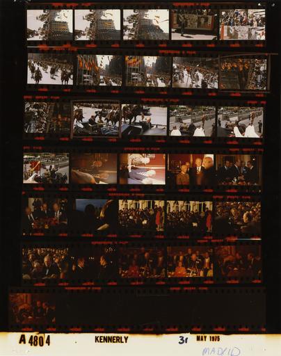| Keywords: Ford A4804 NLGRF photo contact sheet (1975-05-31)(Gerald Ford Library).jpg White House Photographic Office WHPO is housed at the Gerald R Ford Presidential Library a branch of the National Archives and Records Administration NARA <br/><br/> This file is a 200 dpi photo contact sheet having images from roll of film A4804 of the August 9 1974 - January 20 1977 Gerald R Ford White House Photographic Office Series A0001-A9999 and B0001-B2886 photographs <br/><br/> The date on the photo contact sheet is the date the roll of film was processed not necessarily the date the photographs were taken See table below for additional details 1975-05-31 Gerald R Ford Presidential Library Image http //www fordlibrarymuseum gov/library/whphotos/A4804_NLGRF jpg A4804_NLGRF jpg from http //www fordlibrarymuseum gov/library/whphotos/19750531whpo pdf White House Photographs May 31 1975 of the http //www fordlibrarymuseum gov/Library/whphotos/whpo asp White House Photographic Collection page White House Photographic Office WHPO <br/> Creator David Hume Kennerly PD-USGov Institution Institution Gerald R Ford Presidential Library Table wikitable sortable + Photo contact sheet A4804 U S President Ford Administration Gerald R Ford Library Frame s Tone Subject proper Subject generic Names Geographic Location Photographer Date - 1A-3A Color Trip to Spain - Ceremonial Parade to the Moncloa Palace GRF and Franco riding in Rolls-Royce R-R Phantom IV; standing waving; Guard surrounding car; moving toward camera GRF Generalissimo Francisco Franco; Mounted Ceremonial Guard; Crowd Madrid Spain Ceremonial Parade Route Kennerly 1975-05-31 - 4A-5A Color Trip to Spain - Ceremonial Parade to the Moncloa Palace waving; large posters of GRF and Franco on wall Crowd Madrid Spain Ceremonial Parade Route Kennerly 1975-05-31 - 6A-16A Color Trip to Spain - Ceremonial Parade to the Moncloa Palace GRF and Franco riding in Rolls-Royce R-R Phantom IV; standing waving; Guard surrounding car; various angles and distances GRF Generalissimo Francisco Franco; Mounted Ceremonial Guard; Crowd Madrid Spain Ceremonial Parade Route Kennerly 1975-05-31 - 17A-19A Color Trip to Spain - Prior to Departure of Franco GRF and Franco talking handshaking GRF Generalissimo Francisco Franco Others Madrid Spain Moncloa Palace Kennerly 1975-05-31 - 20A-21A Color Trip to Spain - Visit with Prime Minister and Foreign Minister of Spain standing talking; all may not be in frames GRF Prime Minister Carlos Arias Navaero Pedro Cortina Kissinger Madrid Spain Moncloa Palace Kennerly 1975-05-31 - 22A-26A Color Trip to Spain - Prior to Departure for State Dinner at the Royal Palace GRF waving greeting handshaking; various angles and distances; in formal wear GRF Crowd Madrid Spain Moncloa Palace - Terrace Kennerly 1975-05-31 - 27A Color Trip to Spain - Reception Prior to State Dinner at the Royal Palace standing talking GRF Prince Juan Carlos Madrid Spain Royal Palace - Salon de Columnas Kennerly 1975-05-31 - 28A-29A Color Trip to Spain - State Dinner Hosted by Generalissimo Mrs Francisco Franco BF seated Franco standing making speech Betty Ford Francisco Franco Madrid Spain Royal Palace - State Dining Room Kennerly 1975-05-31 - 30A-31A Color Trip to Spain - Coffee Following State Dinner at the Royal Palace seated talking; interpreter leaning between others GRF Generalissimo Francisco Franco; Interpretor Madrid Spain Royal Palace - Salon de Gasparini Kennerly 1975-05-31 Gerald R Ford Presidential Library and Museum-cooperation PD-USGov Contact sheets by the Ford White House May 1975 Photographs by David Hume Kennerly from 1975 |
