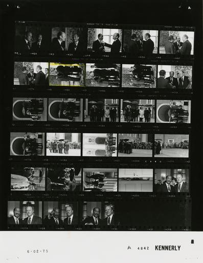 | Keywords: Ford A4842 NLGRF photo contact sheet (1975-06-02)(Gerald Ford Library).jpg White House Photographic Office WHPO is housed at the Gerald R Ford Presidential Library a branch of the National Archives and Records Administration NARA <br/><br/> This file is a 200 dpi photo contact sheet having images from roll of film A4842 of the August 9 1974 - January 20 1977 Gerald R Ford White House Photographic Office Series A0001-A9999 and B0001-B2886 photographs <br/><br/> The date on the photo contact sheet is the date the roll of film was processed not necessarily the date the photographs were taken See table below for additional details 1975-06-02 Gerald R Ford Presidential Library Image http //www fordlibrarymuseum gov/library/whphotos/A4842_NLGRF jpg A4842_NLGRF jpg from http //www fordlibrarymuseum gov/library/whphotos/19750602whpo pdf White House Photographs June 2 1975 of the http //www fordlibrarymuseum gov/Library/whphotos/whpo asp White House Photographic Collection page White House Photographic Office WHPO <br/> Creator David Hume Kennerly PD-USGov Institution Institution Gerald R Ford Presidential Library Table wikitable sortable + Photo contact sheet A4842 U S President Ford Administration Gerald R Ford Library Frame s Tone Subject proper Subject generic Names Geographic Location Photographer Date - 2A-4A BW Trip to Austria - First Meeting with President of Egypt standing talking; close ups; various angles GRF Anwar Al-Sadat Salzburg Austria Residenz Kennerly 1975-06-02 - 5A-8A BW Trip to Austria - First Meeting with President of Egypt standing talking; close ups; Mubarek in last two frames GRF Anwar Al-Sadat Kissinger Salzburg Austria Residenz Kennerly 1975-06-02 - 9A-10A BW Trip to Austria - First Meeting with President of Egypt standing talking; all may not be in frames GRF Anwar Al-Sadat Amb Herman Eilts Amb Ashraf Ghorbal Charles Robinson Ahmad Abu Ismail Rumsfeld Hosny Moubarak Kissinger Ismail Fahmi Sisco Hassam Kamel Hartmann Salzburg Austria Residenz Kennerly 1975-06-02 - 11A BW Trip to Austria - First Meeting with President of Egypt standing talking; close up GRF Anwar Al-Sadat Hosny Moubarak Kissinger Salzburg Austria Residenz Kennerly 1975-06-02 - 12A-21A BW Trip to Austria - Joint Press Conference Following First Meeting with President of Egypt GRF and Sadat speaking at microphone under umbrellas; various angles and distances GRF Anwar Al-Sadat Entourage Media Salzburg Austria Residenz -Courtyard Kennerly 1975-06-02 - 22A-23A BW Trip to Austria - Following First Meeting with President of Egypt handshaking saying goodbye; under umbrellas GRF Anwar Al-Sadat Salzburg Austria Residenz -Courtyard Kennerly 1975-06-02 - 24A BW Trip to Austria - Prior to Luncheon Meeting with President of Egypt walking talking GRF Anwar Al-Sadat Salzburg Austria Sitting Room - Hotel Schloss Klessheim Kennerly 1975-06-02 - 25A BW Trip to Austria - Prior to Luncheon Meeting with President of Egypt taken through slightly open door Salzburg Austria Hotel Schloss Klessheim Kennerly 1975-06-02 - 26A299A BW Trip to Austria - Meeting with President of Egypt close ups; head and shoulder portrait s GRF Anwar Al-Sadat Salzburg Austria Hotel Schloss Klessheim Kennerly 1975-06-02 Gerald R Ford Presidential Library and Museum-cooperation PD-USGov Contact sheets by the Ford White House June 1975 Photographs by David Hume Kennerly from 1975 |