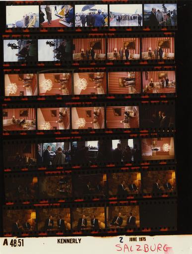 | Keywords: Ford A4851 NLGRF photo contact sheet (1975-06-01)(Gerald Ford Library).jpg White House Photographic Office WHPO is housed at the Gerald R Ford Presidential Library a branch of the National Archives and Records Administration NARA <br/><br/> This file is a 200 dpi photo contact sheet having images from roll of film A4851 of the August 9 1974 - January 20 1977 Gerald R Ford White House Photographic Office Series A0001-A9999 and B0001-B2886 photographs <br/><br/> The date on the photo contact sheet is the date the roll of film was processed not necessarily the date the photographs were taken See table below for additional details 1975-06-01 Gerald R Ford Presidential Library Image http //www fordlibrarymuseum gov/library/whphotos/A4851_NLGRF jpg A4851_NLGRF jpg from http //www fordlibrarymuseum gov/library/whphotos/19750601whpo pdf White House Photographs June 1 1975 of the http //www fordlibrarymuseum gov/Library/whphotos/whpo asp White House Photographic Collection page White House Photographic Office WHPO <br/> Creator David Hume Kennerly PD-USGov Institution Institution Gerald R Ford Presidential Library Table wikitable sortable + Photo contact sheet A4851 U S President Ford Administration Gerald R Ford Library Frame s Tone Subject proper Subject generic Names Geographic Location Photographer Date - 2-3 Color Trip to Austria - Arrival in Salzburg walking down steps of Air Force One; under umbrellas; GRF stumbling in second frame GRF Betty Ford Salzburg Austria Salzburg Airport Kennerly 1975-06-01 - 4-5 Color Trip to Austria - Arrival in Salzburg greeting handshaking; Air Force One in background in 2nd frame GRF Betty Ford Bruno Kreisky Others Salzburg Austria Salzburg Airport Kennerly 1975-06-01 - 6-8 Color Trip to Austria - Arrival in Salzburg GRF and boy greeting handshaking in first frame; all not in every frame; cow sculpture in all frames GRF Young Boy Kreisky Others Salzburg Austria Salzburg Airport Kennerly 1975-06-01 - 9-16 Color Trip to Austria - Meeting With Chancellor of Austria standing talking GRF Kreisky Salzburg Austria Sitting Room - Hotel Schloss Klessheim Kennerly 1975-06-01 - 17-22 Color Trip to Austria - Meeting With Chancellor of Austria seated talking GRF Kreisky Salzburg Austria Sitting Room - Hotel Schloss Klessheim Kennerly 1975-06-01 - 23-25 Color Trip to Austria - Departure of Chancellor of Austria handshaking saying goodbye; GRF and BF walking toward door in last frame GRF Betty Ford Bruno Kreisky Others Salzburg Austria Hotel Schloss Klessheim -Outside Kennerly 1975-06-01 - 26 Color Trip to Austria walking back toward camera GRF Salzburg Austria Sitting Room - Hotel Schloss Klessheim Kennerly 1975-06-01 - 27-35 Color Trip to Austria - Meeting with President of Egypt seated talking GRF Anwar Al-Sadat Salzburg Austria Hotel Schloss Fuschl Kennerly 1975-06-01 Gerald R Ford Presidential Library and Museum-cooperation PD-USGov Contact sheets by the Ford White House June 1975 Photographs by David Hume Kennerly from 1975 |