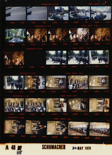 | Keywords: Ford A4888 NLGRF photo contact sheet (1975-05-31)(Gerald Ford Library).jpg White House Photographic Office WHPO is housed at the Gerald R Ford Presidential Library a branch of the National Archives and Records Administration NARA <br/><br/> This file is a 200 dpi photo contact sheet having images from roll of film A4888 of the August 9 1974 - January 20 1977 Gerald R Ford White House Photographic Office Series A0001-A9999 and B0001-B2886 photographs <br/><br/> The date on the photo contact sheet is the date the roll of film was processed not necessarily the date the photographs were taken See table below for additional details 1975-05-31 Gerald R Ford Presidential Library Image http //www fordlibrarymuseum gov/library/whphotos/A4888_NLGRF jpg A4888_NLGRF jpg from http //www fordlibrarymuseum gov/library/whphotos/19750531whpo pdf White House Photographs May 31 1975 of the http //www fordlibrarymuseum gov/Library/whphotos/whpo asp White House Photographic Collection page White House Photographic Office WHPO - Schumacher PD-USGov Institution Institution Gerald R Ford Presidential Library Table wikitable sortable + Photo contact sheet A4888 U S President Ford Administration Gerald R Ford Library Frame s Tone Subject proper Subject generic Names Geographic Location Photographer Date - 7A-8A Color Schumacher 1975-05-31 - 9A-11A Color Trip to Spain - Ceremonial Parade to the Moncloa Palace close up of vehicle passing camera fish eye lens GRF Generalissimo Francisco Franco; Mounted Ceremonial Guard Madrid Spain Ceremonial Parade Route Schumacher 1975-05-31 - 12A Color Trip to Spain walking on path carrying cameras Fitz-Patrick Madrid Spain Moncloa Palace Grounds Schumacher 1975-05-31 - 13A-17A Color Trip to Spain - Meeting with Wife of Generalissimo Franco seated under tapestry; talking Betty Ford Carmen Franco Others Madrid Spain El Pardo Palace Schumacher 1975-05-31 - 18A Color Schumacher 1975-05-31 - 19A-22A Color Trip to Spain - Return to Residence GRF stepping from limousine walking toward palace; guard bowing saluting; media on far left GRF Honor Guard Media Others Madrid Spain Moncloa Palace Grounds Schumacher 1975-05-31 - 23A-36A Color Trip to Spain - Working Luncheon with Spanish Prime Minister and Foreign Minister seated around large rectangular table; various angles and distances; all not in every frame GRF Carlos Arias Navaero; Kissinger Amb Stabler Rumsfeld Hartmann Nessen Sonnenfeldt Scowcroft Col Dixon Samuel Eaton; Rafael Cabello de Alba; Pedro Mauri Francisco Gallegos gabriel da Viega Mariano Median Antonio Martinez Others Madrid Spain Moncloa Palace - Salon de Columnas Schumacher 1975-05-31 Gerald R Ford Presidential Library and Museum-cooperation PD-USGov Contact sheets by the Ford White House May 1975 |