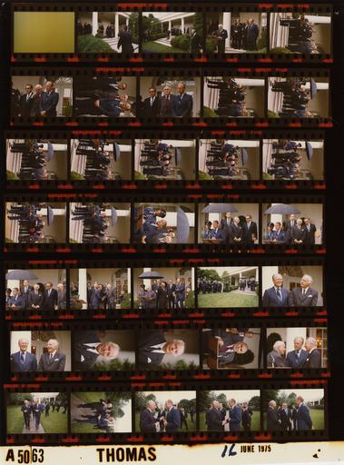 | Keywords: Ford A5063 NLGRF photo contact sheet (1975-06-16)(Gerald Ford Library).jpg White House Photographic Office WHPO is housed at the Gerald R Ford Presidential Library a branch of the National Archives and Records Administration NARA <br/><br/> This file is a 200 dpi photo contact sheet having images from roll of film A5063 of the August 9 1974 - January 20 1977 Gerald R Ford White House Photographic Office Series A0001-A9999 and B0001-B2886 photographs <br/><br/> The date on the photo contact sheet is the date the roll of film was processed not necessarily the date the photographs were taken See table below for additional details 1975-06-16 Gerald R Ford Presidential Library Image http //www fordlibrarymuseum gov/library/whphotos/A5063_NLGRF jpg A5063_NLGRF jpg from http //www fordlibrarymuseum gov/library/whphotos/19750616whpo pdf White House Photographs June 16 1975 of the http //www fordlibrarymuseum gov/Library/whphotos/whpo asp White House Photographic Collection page White House Photographic Office WHPO <br/> Creator David Hume Kennerly PD-USGov Institution Institution Gerald R Ford Presidential Library Table wikitable sortable + Photo contact sheet A5063 U S President Ford Administration Gerald R Ford Library Frame s Tone Subject proper Subject generic Names Geographic Location Photographer Date - 3 Color Kennerly 1975-06-16 - 4-7 Color President Federal Republic of Germany; Announcement of Gift from FRG to the John J McCloy Fund Scheel at microphone speaking in last 3 frames; others standing on Colonnade steps; taken from left of Scheel GRF Walter Scheel Kissinger Others Rose Garden Kennerly 1975-06-16 - 8-10 Color Announcement of Gift from FRG to the John J McCloy Fund standing on steps listening GRF Kissinger McCloy Rose Garden Kennerly 1975-06-16 - 11-17 Color President Federal Republic of Germany; Announcement of Gift from FRG to the John J McCloy Fund Scheel at microphone speaking under umbrella; others standing on Colonnade steps; Scheel presenting gift to McCloy in last three frames GRF Walter Scheel Kissinger McCloy Others Rose Garden Kennerly 1975-06-16 - 18-23 Color President Federal Republic of Germany; Announcement of Gift from FRG to the John J McCloy Fund GRF at microphone speaking under umbrella; others standing on Colonnade steps GRF Walter Scheel Kissinger McCloy Others Rose Garden Kennerly 1975-06-16 - 24-26 Color President Federal Republic of Germany; Announcement of Gift from FRG to the John J McCloy Fund GRF McCloy handshaking in first frame; McCloy at microphone speaking under umbrella; others standing on Colonnade steps; various distances GRF Walter Scheel Kissinger McCloy Others Rose Garden Kennerly 1975-06-16 - 27-28 Color President Federal Republic of Germany standing on Colonnade steps; close ups GRF Walter Scheel Rose Garden Kennerly 1975-06-16 - 29-30 Color President Federal Republic of Germany head and shoulder portraits Walter Scheel Rose Garden Kennerly 1975-06-16 - 31 Color Chairman Board of Directors American Council on Germany at microphone speaking under umbrella John McCloy Rose Garden Kennerly 1975-06-16 - 32 Color President Federal Republic of Germany; Chairman Board of Directors American Council on Germany handshaking near podium; close up GRF Walter Scheel McCloy Rose Garden Kennerly 1975-06-16 - 33-37 Color Departure of the President Federal Republic of Germany walking talking moving toward camera; all not in every frame GRF Kissinger Walter Scheel Hans Dietrich-Genscher Others Sidewalk Between Oval Office and South Driveway Kennerly 1975-06-16 Gerald R Ford Presidential Library and Museum-cooperation PD-USGov Contact sheets by the Ford White House June 1975 Photographs by David Hume Kennerly from 1975 |