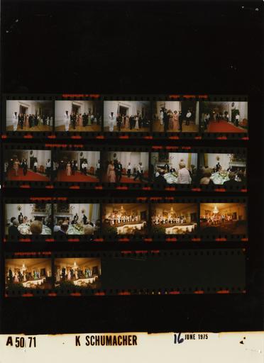 | Keywords: Ford A5071 NLGRF photo contact sheet (1975-06-16)(Gerald Ford Library).jpg White House Photographic Office WHPO is housed at the Gerald R Ford Presidential Library a branch of the National Archives and Records Administration NARA <br/><br/> This file is a 200 dpi photo contact sheet having images from roll of film A5071 of the August 9 1974 - January 20 1977 Gerald R Ford White House Photographic Office Series A0001-A9999 and B0001-B2886 photographs <br/><br/> The date on the photo contact sheet is the date the roll of film was processed not necessarily the date the photographs were taken See table below for additional details 1975-06-16 Gerald R Ford Presidential Library Image http //www fordlibrarymuseum gov/library/whphotos/A5071_NLGRF jpg A5071_NLGRF jpg from http //www fordlibrarymuseum gov/library/whphotos/19750616whpo pdf White House Photographs June 16 1975 of the http //www fordlibrarymuseum gov/Library/whphotos/whpo asp White House Photographic Collection page White House Photographic Office WHPO - Schumacher PD-USGov Institution Institution Gerald R Ford Presidential Library Table wikitable sortable + Photo contact sheet A5071 U S President Ford Administration Gerald R Ford Library Frame s Tone Subject proper Subject generic Names Geographic Location Photographer Date - 3A-5A Color Receiving Line Prior to State Dinner for the President Federal Republic of Germany greeting handshaking with guests; guests all not in every frame; formal wear GRF Betty Ford Walter Mildred Scheel; Guests East Room Schumacher 1975-06-16 - 6A Color Receiving Line Prior to State Dinner for the President Federal Republic of Germany standing talking; formal wear GRF Betty Ford Walter Mildred Scheel East Room Schumacher 1975-06-16 - 7A-8A Color State Dinner for the President Federal Republic of Germany walking on red carpet toward State Dining Room; formal wear GRF Mildred Scheel Cross Hall Schumacher 1975-06-16 - 9A-10A Color State Dinner for the President Federal Republic of Germany walking on red carpet toward State Dining Room; formal wear Betty Ford Walter Scheel Cross Hall Schumacher 1975-06-16 - 11A-14A Color State Dinner for the President Federal Republic of Germany seated at round tables; various angles; all not in every frame; formal wear GRF Betty Ford Walter Mildred Scheel; Guests State Dining Room Schumacher 1975-06-16 - 15A-19A Color Entertainment Following State Dinner for the President Federal Republic of Germany performing on stage Tennessee Ernie Ford Opryland Dancers East Room Schumacher 1975-06-16 Gerald R Ford Presidential Library and Museum-cooperation PD-USGov Contact sheets by the Ford White House June 1975 |