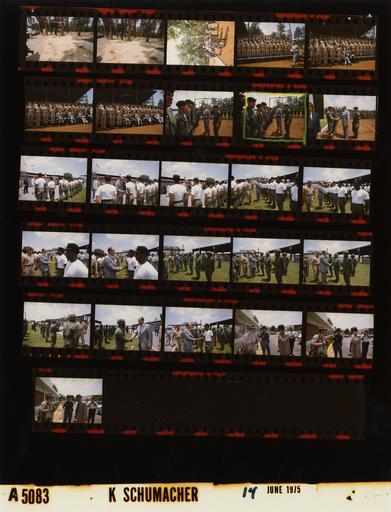 | Keywords: Ford A5083 NLGRF photo contact sheet (1975-06-14)(Gerald Ford Library).jpg White House Photographic Office WHPO is housed at the Gerald R Ford Presidential Library a branch of the National Archives and Records Administration NARA <br/><br/> This file is a 200 dpi photo contact sheet having images from roll of film A5083 of the August 9 1974 - January 20 1977 Gerald R Ford White House Photographic Office Series A0001-A9999 and B0001-B2886 photographs <br/><br/> The date on the photo contact sheet is the date the roll of film was processed not necessarily the date the photographs were taken See table below for additional details 1975-06-14 Gerald R Ford Presidential Library Image http //www fordlibrarymuseum gov/library/whphotos/A5083_NLGRF jpg A5083_NLGRF jpg from http //www fordlibrarymuseum gov/library/whphotos/19750614whpo pdf White House Photographs June 14 1975 of the http //www fordlibrarymuseum gov/Library/whphotos/whpo asp White House Photographic Collection page White House Photographic Office WHPO - Schumacher PD-USGov Institution Institution Gerald R Ford Presidential Library Table wikitable sortable + Photo contact sheet A5083 U S President Ford Administration Gerald R Ford Library Frame s Tone Subject proper Subject generic Names Geographic Location Photographer Date - 1-3 Color Trip to Georgia - 200th Anniversary of the U S Army Infantry - Columbus Georgia walking through open area; 1st 2 frames are long shots GRF Others Columbus GA Fort Benning Schumacher 1975-06-14 - 4-7 Color Trip to Georgia - 200th Anniversary of the U S Army Infantry - Columbus Georgia seated in grandstands watching Ranger demonstration GRF Military Officers Guests Crowd Columbus GA Fort Benning -Victory Pond Schumacher 1975-06-14 - 8-23 Color Trip to Georgia - 200th Anniversary of the U S Army Infantry - Columbus Georgia greeting handshaking; various angles and distances; all not in every frame GRF U S Army Soldiers Columbus GA Fort Benning -Victory Pond Schumacher 1975-06-14 - 24-26 Color Trip to Georgia - Columbus Georgia standing talking in parking lot Secret Service PoliceWoman Photographer Columbus GA Holiday Inn North Schumacher 1975-06-14 Gerald R Ford Presidential Library and Museum-cooperation PD-USGov Contact sheets by the Ford White House June 1975 |