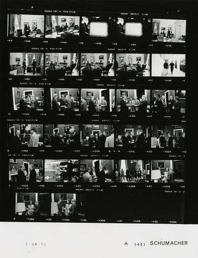 Keywords: Ford A5421 NLGRF photo contact sheet (1975-07-08)(Gerald Ford Library).jpg White House Photographic Office WHPO is housed at the Gerald R Ford Presidential Library a branch of the National Archives and Records Administration NARA <br/><br/> This file is a 200 dpi photo contact sheet having images from roll of film A5421 of the August 9 1974 - January 20 1977 Gerald R Ford White House Photographic Office Series A0001-A9999 and B0001-B2886 photographs <br/><br/> The date on the photo contact sheet is the date the roll of film was processed not necessarily the date the photographs were taken See table below for additional details 1975-07-08 Gerald R Ford Presidential Library Image http //www fordlibrarymuseum gov/library/whphotos/A5421_NLGRF jpg A5421_NLGRF jpg from http //www fordlibrarymuseum gov/library/whphotos/19750708whpo pdf White House Photographs July 8 1975 of the http //www fordlibrarymuseum gov/Library/whphotos/whpo asp White House Photographic Collection page White House Photographic Office WHPO - Schumacher PD-USGov Institution Institution Gerald R Ford Presidential Library Table wikitable sortable + Photo contact sheet A5421 U S President Ford Administration Gerald R Ford Library Frame s Tone Subject proper Subject generic Names Geographic Location Photographer Date - 3A-4A BW standing near desk in 1st frame; seated writing in 2nd GRF Oval Office Schumacher 1975-07-08 - 5A-6A BW embroidered pillow; too light to read White House Schumacher 1975-07-08 - 7A BW walking toward desk GRF Oval Office Schumacher 1975-07-08 - 8A-11A BW Representative from New York NY standing talking in 1st frame; seated around desk in remainder GRF Rep Conable Oval Office Schumacher 1975-07-08 - 12A BW walking toward Cabinet Room; backs to camera GRF Jack Ford Colonnade Schumacher 1975-07-08 - 13A-29A BW Private Reception for President Ford Committee and Advisory Committee Members greeting handshaking standing talking; all not in every frame GRF Betty Ford Jack Ford; Callaway Packard Burch M Fisher R Bliss Scranton Harlow R Herman Parma R Douglas; Sens Scott Dole; Hartmann Rumsfeld Cheney Others Red Room Schumacher 1975-07-08 Gerald R Ford Presidential Library and Museum-cooperation PD-USGov Contact sheets by the Ford White House July 1975