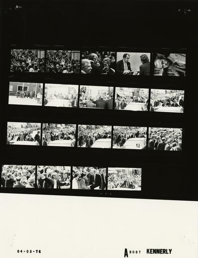| Keywords: Ford A9087 NLGRF photo contact sheet (1976-04-02)(Gerald Ford Library).jpg White House Photographic Office WHPO is housed at the Gerald R Ford Presidential Library a branch of the National Archives and Records Administration NARA <br/><br/> This file is a 200 dpi photo contact sheet having images from roll of film A9087 of the August 9 1974 - January 20 1977 Gerald R Ford White House Photographic Office Series A0001-A9999 and B0001-B2886 photographs <br/><br/> The date on the photo contact sheet is the date the roll of film was processed not necessarily the date the photographs were taken See table below for additional details 1976-04-02 Gerald R Ford Presidential Library Image http //www fordlibrarymuseum gov/library/whphotos/A9087_NLGRF jpg A9087_NLGRF jpg from http //www fordlibrarymuseum gov/library/whphotos/19760402whpo pdf White House Photographs April 2 1976 of the http //www fordlibrarymuseum gov/Library/whphotos/whpo asp White House Photographic Collection page White House Photographic Office WHPO <br/> Creator David Hume Kennerly PD-USGov Institution Institution Gerald R Ford Presidential Library Table wikitable sortable + Photo contact sheet A9087 U S President Ford Administration Gerald R Ford Library Frame s Tone Subject proper Subject generic Names Geographic Location Photographer Date - 3A-5A BW Campaign Trip to Wisconsin; Public Forum - West Bend Wisconsin man and girl standing in audience; girl asking question at microphone Unidentified Man Girl Crowd West Bend WI West Bend High School - Fieldhouse Kennerly 1976-04-02 - 6A BW Campaign Trip to Wisconsin; Public Forum - West Bend Wisconsin seated talking Eric Rosenberger Red Cavaney West Bend WI West Bend High School - Fieldhouse Kennerly 1976-04-02 - 7A BW Campaign Trip to Wisconsin; President's Personal Photographer - West Bend Wisconsin close up portrait suit and tie Kennerly West Bend WI West Bend High School - Fieldhouse Kennerly 1976-04-02 - 8A-21A BW Campaign Trip to Wisconsin; Motorcade and Parade from Goodrich High School to Town Square; US Representative from Wisconsin WI limousine driving down crowded street; standing in sun roof waving; GRF on pavement working crowd handshaking; GRF in sunroof with microphone; various angles and distances; all not in every frame GRF Rep William Steiger Secret Service School Marching Band Crowd Fond du Lac WI Streets of Fond du Lac Kennerly 1976-04-03 Gerald R Ford Presidential Library and Museum-cooperation PD-USGov Contact sheets by the Ford White House April 1976 Photographs by David Hume Kennerly from 1976 |