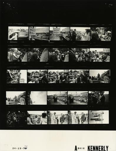Keywords: Ford A9416 NLGRF photo contact sheet (1976-04-29)(Gerald Ford Library).jpg White House Photographic Office WHPO is housed at the Gerald R Ford Presidential Library a branch of the National Archives and Records Administration NARA <br/><br/> This file is a 200 dpi photo contact sheet having images from roll of film A9416 of the August 9 1974 - January 20 1977 Gerald R Ford White House Photographic Office Series A0001-A9999 and B0001-B2886 photographs <br/><br/> The date on the photo contact sheet is the date the roll of film was processed not necessarily the date the photographs were taken See table below for additional details 1976-04-29 Gerald R Ford Presidential Library Image http //www fordlibrarymuseum gov/library/whphotos/A9416_NLGRF jpg A9416_NLGRF jpg from http //www fordlibrarymuseum gov/library/whphotos/19760429whpo pdf White House Photographs April 29 1976 of the http //www fordlibrarymuseum gov/Library/whphotos/whpo asp White House Photographic Collection page White House Photographic Office WHPO <br/> Creator David Hume Kennerly PD-USGov Institution Institution Gerald R Ford Presidential Library Table wikitable sortable + Photo contact sheet A9416 U S President Ford Administration Gerald R Ford Library Frame s Tone Subject proper Subject generic Names Geographic Location Photographer Date - 2-4 BW Primary Campaign Trip to Texas-Parade in Honor of GRF Unveiling Ceremony for Montgomery County Texas War Memorial Park GRF Tower standing in sunroof waving to crowd limousine driving past Keep Right sign GRF Sen John Tower Crowd Conroe TX streets of Conroe Kennerly 1976-04-29 - 5-15 BW Primary Campaign Trip to Texas-Unveiling Ceremony for Montgomery County Texas War Memorial Park-Arriving for GRF working crowd at rope; kissing girls in cowgirl and majorette costumes waving reaching GRF girls Crowd Secret Service Conroe TX Montgomery County Texas War Memorial Park Kennerly 1976-04-29 - 12-16 BW Primary Campaign Trip to Texas-Unveiling Ceremony for Montgomery County Texas War Memorial Park-Remarks GRF at podium; various angles and distances; balloons rising in frame 14 GRF Crowd Secret Service Conroe TX Montgomery County Texas War Memorial Park Kennerly 1976-04-29 - 17-18 BW Primary Campaign Trip to Texas-Reception for PFC Staff Volunteers and Families handshaking outside while arriving and departing; handshaking indoors at reception GRF Crowd Staff Conroe TX Outside and Inside Holiday Inn Kennerly 1976-04-29 - 19-22 BW Primary Campaign Trip to Texas-Airport Departure GRF greets family on tarmac; 24-25 Mosbacher stands by GRF Unidentified Family Robert Mosbacher Houston TX Houston Intercontinental Airport Kennerly 1976-04-29 Gerald R Ford Presidential Library and Museum-cooperation PD-USGov Contact sheets by the Ford White House April 1976 Photographs by David Hume Kennerly from 1976 |