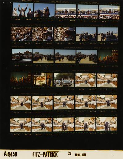 | Keywords: Ford A9459 NLGRF photo contact sheet (1976-04-27)(Gerald Ford Library).jpg White House Photographic Office WHPO is housed at the Gerald R Ford Presidential Library a branch of the National Archives and Records Administration NARA <br/><br/> This file is a 200 dpi photo contact sheet having images from roll of film A9459 of the August 9 1974 - January 20 1977 Gerald R Ford White House Photographic Office Series A0001-A9999 and B0001-B2886 photographs <br/><br/> The date on the photo contact sheet is the date the roll of film was processed not necessarily the date the photographs were taken See table below for additional details 1976-04-27 Gerald R Ford Presidential Library Image http //www fordlibrarymuseum gov/library/whphotos/A9459_NLGRF jpg A9459_NLGRF jpg from http //www fordlibrarymuseum gov/library/whphotos/19760427whpo pdf White House Photographs April 27 1976 of the http //www fordlibrarymuseum gov/Library/whphotos/whpo asp White House Photographic Collection page White House Photographic Office WHPO - Fitz-Patrick PD-USGov Institution Institution Gerald R Ford Presidential Library Table wikitable sortable + Photo contact sheet A9459 U S President Ford Administration Gerald R Ford Library Frame s Tone Subject proper Subject generic Names Geographic Location Photographer Date - 2-9 Color Primary Campaign Trip to Louisiana; Holiday in Dixie Rally; Remarks Broadcast on Live Local Television; festival celebrated in three corner area of Arkansas AR Louisiana LA and Texas TX ; US Representative from Louisiana - Bossier City Louisiana GRF waves from platform with Waggonner; put seal on podium; midrange GRF at podium; Air Force One plane in background audience in foreground; departing handshaking in a sea of people GRF Rep Joe D Waggonner Jr ; platform Officials; Crowd Bossier City LA Barksdale Air Force Base Fitz-Patrick 1976-04-27 - 10-15 Color Primary Campaign Trip to Louisiana; Motocade thru Barksdale AFB from Guest Quarters to Hangar 1-A Auditorium - Bossier City Louisiana GRF waving from sunroof USSS walking along limousine 226200 GRF Secret Service Crowd Bossier City LA Barksdale Air Force Base Fitz-Patrick 1976-04-27 - 16-17 Color Primary Campaign Trip to Louisiana-Q A Forum for Local Elected Officials sponsored by Mayors of Shreveport and Bossier City midrange shot GRF and guests on stage audience in foreground GRF Platform Guests Audience Bossier City LA Barksdale Air Force Base -Hangar 1-A - Auditorium Fitz-Patrick 1976-04-27 - 18 Color Primary Campaign Trip to Louisiana; Personal Photographer to President - Bossier City Louisiana Kennerly standing by and pointing to Welcome to Louisiana White House sign Kennerly Bossier City LA Barksdale Air Force Base -Guest Quarters Fitz-Patrick 1976-04-27 - 19 Color Primary Campaign Trip to Texas; Motorcade to Tyler Junior College - Tyler Texas GRF waving from limousine 207800 USSS walking along side GRF Secret Service Media Crowd Tyler TX Enroute Sheraton Inn to Tyler Junior College Fitz-Patrick 1976-04-27 - 20-31 Color Primary Campaign Trip to Texas-Tyler Junior College Arrival; Apache Belles Dancing Drill Team GRF walks down aisle between Belles kissing handshaking; all not in every frame GRF Apache Belles Tyler TX Tyler Junior College Fitz-Patrick 1976-04-28 Gerald R Ford Presidential Library and Museum-cooperation PD-USGov Contact sheets by the Ford White House April 1976 |