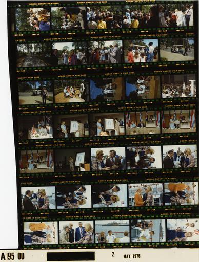 | Keywords: Ford A9500 NLGRF photo contact sheet (1976-04-30)(Gerald Ford Library).jpg White House Photographic Office WHPO is housed at the Gerald R Ford Presidential Library a branch of the National Archives and Records Administration NARA <br/><br/> This file is a 200 dpi photo contact sheet having images from roll of film A9500 of the August 9 1974 - January 20 1977 Gerald R Ford White House Photographic Office Series A0001-A9999 and B0001-B2886 photographs <br/><br/> The date on the photo contact sheet is the date the roll of film was processed not necessarily the date the photographs were taken See table below for additional details 1976-04-30 Gerald R Ford Presidential Library Image http //www fordlibrarymuseum gov/library/whphotos/A9500_NLGRF jpg A9500_NLGRF jpg from http //www fordlibrarymuseum gov/library/whphotos/19760430whpo pdf White House Photographs April 30 1976 of the http //www fordlibrarymuseum gov/Library/whphotos/whpo asp White House Photographic Collection page White House Photographic Office WHPO - Unidentified PD-USGov Institution Institution Gerald R Ford Presidential Library Table wikitable sortable + Photo contact sheet A9500 U S President Ford Administration Gerald R Ford Library Frame s Tone Subject proper Subject generic Names Geographic Location Photographer Date - 1-14 Color Susan Ford as Queen of 1976 International Azalea Festival-Coronation Rehearsal standing outside talking to children; riding cart sitting onstage Susan Ford Children Dignitaries Audience Norfolk VA Gardens-by-the Sea/Botanical Gardens Unidentified 1976-04-30 - 15-22 Color Susan Ford as Queen of 1976 International Azalea Festival-Tidewater Fashion Show Luncheon; Entertainment Susan walking to head table Susan remarks; present Queen portrait and painting; woman singing on stage by portrait Susan Ford Audience princesses Unidentified Head Table Guests Presenters Norfolk VA Omni International Hotel Unidentified 1976-04-30 - 23-37 Color Susan Ford as Queen of 1976 International Azalea Festival-Norfolk Harbor Tour; Naval officer Susan receiving framed item and The Virginia Way book; handshaking; Susan and escort Kingsman riding on boat Susan Ford Unidenitified Men; Guests; Midshipman Kilton D Kingsman Norfolk VA Omni Hotel Landing/Norfolk Harbor Unidentified 1976-04-30 Gerald R Ford Presidential Library and Museum-cooperation PD-USGov Contact sheets by the Ford White House April 1976 |