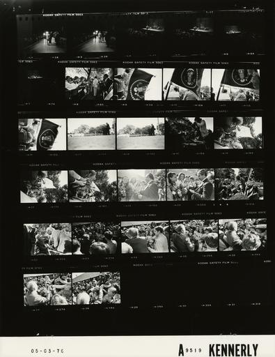 Keywords: Ford A9519 NLGRF photo contact sheet (1976-05-03)(Gerald Ford Library).jpg White House Photographic Office WHPO is housed at the Gerald R Ford Presidential Library a branch of the National Archives and Records Administration NARA <br/><br/> This file is a 200 dpi photo contact sheet having images from roll of film A9519 of the August 9 1974 - January 20 1977 Gerald R Ford White House Photographic Office Series A0001-A9999 and B0001-B2886 photographs <br/><br/> The date on the photo contact sheet is the date the roll of film was processed not necessarily the date the photographs were taken See table below for additional details 1976-05-03 Gerald R Ford Presidential Library Image http //www fordlibrarymuseum gov/library/whphotos/A9519_NLGRF jpg A9519_NLGRF jpg from http //www fordlibrarymuseum gov/library/whphotos/19760503whpo pdf White House Photographs May 3 1976 of the http //www fordlibrarymuseum gov/Library/whphotos/whpo asp White House Photographic Collection page White House Photographic Office WHPO <br/> Creator David Hume Kennerly PD-USGov Institution Institution Gerald R Ford Presidential Library Table wikitable sortable + Photo contact sheet A9519 U S President Ford Administration Gerald R Ford Library Frame s Tone Subject proper Subject generic Names Geographic Location Photographer Date - 2-7 BW Trip to Alabama; Chamber of Commerce Public Forum -Birmingham Alabama GRF arriving onstage handshaking speaking at podium; platform guests seated behind; dark room long view GRF Platform Guests Birmingham AL Jefferson Civic Center Kennerly 1976-05-03 - 8 BW Trip to Alabama; Campaign Rally - Birmingham Alabama GRF reaches to handshake; crowd applauding behind rope GRF Crowd Secret Service Birmingham AL Wilson Park Kennerly 1976-05-03 - 9-14 BW Trip to Alabama; Campaign Rally; GRF Remarks - Birmingham Alabama GRF at podium; under presidential seal flag; long side view of event audience seated; flag obstructs four frames GRF Platform Guests Audience Birmingham AL Wilson Park Kennerly 1976-05-03 - 15-28 BW Trip to Alabama; Campaign Rally - Birmingham Alabama GRFhandshaking at rope; signing autographs; girl holding history points poster; boy scouts leaning over to listen to elderly man in wheelchair GRF Crowd Birmingham AL Wilson Park Kennerly 1976-05-03 Gerald R Ford Presidential Library and Museum-cooperation PD-USGov Contact sheets by the Ford White House May 1976 Photographs by David Hume Kennerly from 1976 |