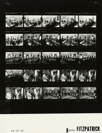 | Keywords: Ford A9555 NLGRF photo contact sheet (1976-05-06)(Gerald Ford Library).jpg White House Photographic Office WHPO is housed at the Gerald R Ford Presidential Library a branch of the National Archives and Records Administration NARA <br/><br/> This file is a 200 dpi photo contact sheet having images from roll of film A9555 of the August 9 1974 - January 20 1977 Gerald R Ford White House Photographic Office Series A0001-A9999 and B0001-B2886 photographs <br/><br/> The date on the photo contact sheet is the date the roll of film was processed not necessarily the date the photographs were taken See table below for additional details 1976-05-06 Gerald R Ford Presidential Library Image http //www fordlibrarymuseum gov/library/whphotos/A9555_NLGRF jpg A9555_NLGRF jpg from http //www fordlibrarymuseum gov/library/whphotos/19760506whpo pdf White House Photographs May 6 1976 of the http //www fordlibrarymuseum gov/Library/whphotos/whpo asp White House Photographic Collection page White House Photographic Office WHPO - Fitz-Patrick PD-USGov Institution Institution Gerald R Ford Presidential Library Table wikitable sortable + Photo contact sheet A9555 U S President Ford Administration Gerald R Ford Library Frame s Tone Subject proper Subject generic Names Geographic Location Photographer Date - 3-8 BW Meeting with California Finance Chairman for PFC and President of Carter Hawley Hale Department Stores Los Angeles seated around desk; Cheney in 3 frames; Carter and GRF together in 3 frames GRF Edward W Carter; Cheney Oval Office Fitz-Patrick 1976-05-06 - 9-18 BW Meeting to Discuss Social Security Long-Range Financing seated around table both sides shown GRF Buchen Lazarus Friedersdorf Seidman Cannon Quern Moore Lynn O'Neill Greenspan Malkiel Mathews Wm A Morrill Ronald L Davis Usery Henry Perritt George Dixon James Van Horne David Ranson James Baker Cabinet Room Fitz-Patrick 1976-05-06 - 19-24 BW Reception for Members of the Association of American Editorial Cartoonists-Meeting with AAEC Pres Hill; AAEC VP Warren; AAEC Secy-Treas Jurden; AAEC Director MacNelley standing talking GRF Draper Hill Thomas Curtis L D Warren Jack Jurden Jeff MacNelley Red Room Fitz-Patrick 1976-05-06 - 25-27 BW Reception for Members of the Association of American Editorial Cartoonists-GRF Remarks GRF at podium guests seated GRF Guests State Dining Room Fitz-Patrick 1976-05-06 Gerald R Ford Presidential Library and Museum-cooperation PD-USGov Contact sheets by the Ford White House May 1976 |