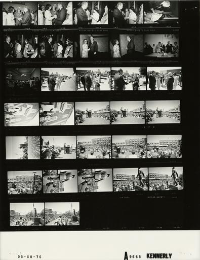| Keywords: Ford A9665 NLGRF photo contact sheet (1976-05-08)(Gerald Ford Library).jpg White House Photographic Office WHPO is housed at the Gerald R Ford Presidential Library a branch of the National Archives and Records Administration NARA <br/><br/> This file is a 200 dpi photo contact sheet having images from roll of film A9665 of the August 9 1974 - January 20 1977 Gerald R Ford White House Photographic Office Series A0001-A9999 and B0001-B2886 photographs <br/><br/> The date on the photo contact sheet is the date the roll of film was processed not necessarily the date the photographs were taken See table below for additional details 1976-05-08 Gerald R Ford Presidential Library Image http //www fordlibrarymuseum gov/library/whphotos/A9665_NLGRF jpg A9665_NLGRF jpg from http //www fordlibrarymuseum gov/library/whphotos/19760508whpo pdf White House Photographs May 8 1976 of the http //www fordlibrarymuseum gov/Library/whphotos/whpo asp White House Photographic Collection page White House Photographic Office WHPO <br/> Creator David Hume Kennerly PD-USGov Institution Institution Gerald R Ford Presidential Library Table wikitable sortable + Photo contact sheet A9665 U S President Ford Administration Gerald R Ford Library Frame s Tone Subject proper Subject generic Names Geographic Location Photographer Date - 4-10 BW Trip to Nebraska; Reception for Nebraska State PFC Staff and Volunteers - Lincoln Nebraska GRF at microphone address to 150 persons applauding wearing PFC hats GRF PFC staff Volunteerss Lincoln NE Lincoln Hilton Hotel - Grand Ballroom East Kennerly 1976-05-08 - 11-12 BW Trip to Nebraska; Remarks to Nebraska Educational Secretaries Association Convention Luncheon -Lincoln Nebraska standing with unidentified woman; on platform making remarks at podium GRF GRF Unidentified female Member Attendees Lincoln NE Lincoln Hilton Hotel Kennerly 1976-05-08 - 13-16 BW Trip to Missouri-Dedication Ceremony of the Harry S Truman Statue-Arrival greetings on sidewalk handshaking; statue in background GRF Clifton Margaret Truman Daniel Gov Mrs Christopher Bond Betty Ford Dr Harry Jonas Secret Service Independence MO Independence Square Courthouse -Outside Kennerly 1976-05-08 - 17-18 BW Trip to Missouri-Dedication Ceremony of the Harry S Truman Statue emerging from door of building waving GRF Betty Ford Independence MO Independence Square Courthouse -Outside Kennerly 1976-05-08 - 19-22 BW Trip to Missouri; Dedication Ceremony of the Harry S Truman Statue; Remarks by US Senator from Minnesota MN Introduction Sen Hubert Humphrey Independence MO Independence Square Courthouse -Outside Kennerly 1976-05-08 - 23 BW Trip to Missouri-Dedication Ceremony of the Harry S Truman Statue-Introduction by Missouri Governor Christopher S Bond; Governor of Missouri MO ; US Senator from Minnesota MN Bond at podium profile view; Humphrey GRF others seated on platform; statue in rear Gov Christopher Bond; Sen Hubert Humphrey Independence MO Independence Square Courthouse -Outside Kennerly 1976-05-08 - 24-33 BW Trip to Missouri-Dedication Ceremony of the Harry S Truman Statue-GRF Remarks GRF at podium crowded seated; Sears Catalog Store across street; Truman statue in most frames; various views and angles GRF Crowd Independence MO Independence Square Courthouse -Outside Kennerly 1976-05-08 Gerald R Ford Presidential Library and Museum-cooperation PD-USGov Contact sheets by the Ford White House May 1976 Photographs by David Hume Kennerly from 1976 |