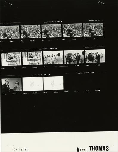 | Keywords: Ford A9797 NLGRF photo contact sheet (1976-05-16)(Gerald Ford Library).jpg White House Photographic Office WHPO is housed at the Gerald R Ford Presidential Library a branch of the National Archives and Records Administration NARA <br/><br/> This file is a 200 dpi photo contact sheet having images from roll of film A9797 of the August 9 1974 - January 20 1977 Gerald R Ford White House Photographic Office Series A0001-A9999 and B0001-B2886 photographs <br/><br/> The date on the photo contact sheet is the date the roll of film was processed not necessarily the date the photographs were taken See table below for additional details 1976-05-16 Gerald R Ford Presidential Library Image http //www fordlibrarymuseum gov/library/whphotos/A9797_NLGRF jpg A9797_NLGRF jpg from http //www fordlibrarymuseum gov/library/whphotos/19760516whpo pdf White House Photographs May 16 1976 of the http //www fordlibrarymuseum gov/Library/whphotos/whpo asp White House Photographic Collection page White House Photographic Office WHPO - Thomas PD-USGov Institution Institution Gerald R Ford Presidential Library Table wikitable sortable + Photo contact sheet A9797 U S President Ford Administration Gerald R Ford Library Frame s Tone Subject proper Subject generic Names Geographic Location Photographer Date - 2A-6A BW Primary Campaign Whistle-Stop Tour of Michigan; Saginaw Township Bicentennial Celebration; GRF Remarks - Saginaw Michigan GRF address crowd from podium Betty in brown and white eagle dress GRF Betty Ford Crowd Saginaw MI Sherwood Elementary School Thomas 1976-05-16 - 7A-8A BW Primary Campaign Whistle-Stop Tour of Michigan; Departing from Saginaw Township Bicentennial Celebration; Army Aide Barrett - Saginaw Michigan BF and Susan Ford embracing by limousine door Betty Ford Susan Ford Maj Robert E Barrett Secret Service Police Saginaw MI Sherwood Elementary School Thomas 1976-05-16 - 9A-11A BW Primary Campaign Whistle-Stop Tour of Michigan; Saginaw Departure - Saginaw Michigan handshaking on tarmac GRF Police Officers Others Saginaw MI Tri-City Airport Thomas 1976-05-16 - 12A BW Primary Campaign Whistle-Stop Tour of Michigan; Interview with Statewide Radio Station Representatives - Saginaw Michigan standing together GRF Unidentified Man Saginaw MI Tri-City Airport Thomas 1976-05-16 - 13A-14A BW Primary Campaign Whistle-Stop Tour of Michigan; Saginaw Departure - Saginaw Michigan waving from top of ramp of plane GRF Saginaw MI Tri-City Airport Thomas 1976-05-16 Gerald R Ford Presidential Library and Museum-cooperation PD-USGov Contact sheets by the Ford White House May 1976 |