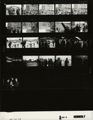 | Keywords: Ford A9813 NLGRF photo contact sheet (1976-05-14)(Gerald Ford Library).jpg White House Photographic Office WHPO is housed at the Gerald R Ford Presidential Library a branch of the National Archives and Records Administration NARA <br/><br/> This file is a 200 dpi photo contact sheet having images from roll of film A9813 of the August 9 1974 - January 20 1977 Gerald R Ford White House Photographic Office Series A0001-A9999 and B0001-B2886 photographs <br/><br/> The date on the photo contact sheet is the date the roll of film was processed not necessarily the date the photographs were taken See table below for additional details 1976-05-14 Gerald R Ford Presidential Library Image http //www fordlibrarymuseum gov/library/whphotos/A9813_NLGRF jpg A9813_NLGRF jpg from http //www fordlibrarymuseum gov/library/whphotos/19760514whpo pdf White House Photographs May 14 1976 of the http //www fordlibrarymuseum gov/Library/whphotos/whpo asp White House Photographic Collection page White House Photographic Office WHPO <br/> Creator David Hume Kennerly PD-USGov Institution Institution Gerald R Ford Presidential Library Table wikitable sortable + Photo contact sheet A9813 U S President Ford Administration Gerald R Ford Library Frame s Tone Subject proper Subject generic Names Geographic Location Photographer Date - 3A BW Primary Campaign Trip to Tennessee-Airport Departure for Memphis TN standing talking on tarmac GRF Unidentified Man Secret Service Bristol TN Tri-City Airport Kennerly 1976-05-14 - 4A-5A BW Primary Campaign Trip to Tennessee; Dedication of Commerce Square Fountain; Sen Howard Baker's Remarks; US Senators from Tennessee TN Baker speaking at podium; crowd filling city street; all platform guests not shown Sen Howard Baker Crowd Secret Service; GRF Sen William Brock Mayor Ron Nixon Mayor Wyeth Chandler James McGehee Wayne Pyeatt Memphis TN Mid-America Mall Kennerly 1976-05-14 - 6A-11A BW Primary Campaign Trip to Tennessee; Dedication of Commerce Square Fountain; Remarks; US Senators from Tennessee TN GRF speaking at podium; crowd filling city street; Brock joins GRF on platform; all platform guests not shown; GRF waving good-bye GRF Crowd Secret Service; Sens Howard Baker William Brock Mayor Ron Nixon Mayor Wyeth Chandler James McGehee Wayne Pyeatt Memphis TN Mid-America Mall Kennerly 1976-05-14 - 12A BW Primary Campaign Trip to Tennessee-Hotel Arrival; Inn Board Chrm Wilson; Innkeeper Wendel Sales Director Beth arriving at curb; all not shown GRF Mr Mrs Kemmons Wilson Harry Wendel Jens Beth Memphis TN Holiday Inn Rivermont Kennerly 1976-05-14 - 13A-14A Color Primary Campaign Trip to Tennessee-Airport Departure; Bicentennial Pillow Presentation by Christ Untied Methodist Day School students GRF leaning over to talk to 6 children holding pillow; crowd behind rope GRF Children Crowd Memphis TN Memphis International Airport Kennerly 1976-05-14 - 15A-17A BW Primary Campaign Trip to Kentucky; Arrival Kentucky Fair and Exposition Center; Kentucky RNC Chairman Middleton and Committeewoman Barton Mrs Harold Barton - Louisville Kentucky standing by limo on curb handshaking talking; waving GRF Edwin Middleton Nelda Barton Others Louisville KY Kentucky Fair and Exposition Center Kennerly 1976-05-14 - 18A BW Primary Campaign Trip to Kentucky; 15th Annual Louisville Armed Forces Day Dinner; Gen Van Stockum Retired USMC - Louisville Kentucky long shot of GRF at podium head guests seated at table darkened audience GRF Gen Richard Frymire Gen Ronald Van Stockum Louisville KY Galt House Hotel Kennerly 1976-05-14 - 19A BW Primary Campaign Trip to Kentucky; Hotel Departure - Louisville Kentucky standing across street from hotel behind rope Crowd Louisville KY Galt House Hotel Kennerly 1976-05-14 - 20A-23A BW Primary Campaign Trip to Kentucky; Airport Departure - Louisville Kentucky handshaking on tarmac; saying goodbye; Air Force One in background in frame 22A; raincoat GRF Police Oficers Others Louisville KY Standiford Field Kennerly 1976-05-14 Gerald R Ford Presidential Library and Museum-cooperation PD-USGov Contact sheets by the Ford White House May 1976 Photographs by David Hume Kennerly from 1976 |