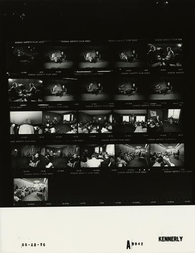 | Keywords: Ford A9942 NLGRF photo contact sheet (1976-05-22)(Gerald Ford Library).jpg White House Photographic Office WHPO is housed at the Gerald R Ford Presidential Library a branch of the National Archives and Records Administration NARA <br/><br/> This file is a 200 dpi photo contact sheet having images from roll of film A9942 of the August 9 1974 - January 20 1977 Gerald R Ford White House Photographic Office Series A0001-A9999 and B0001-B2886 photographs <br/><br/> The date on the photo contact sheet is the date the roll of film was processed not necessarily the date the photographs were taken See table below for additional details 1976-05-22 Gerald R Ford Presidential Library Image http //www fordlibrarymuseum gov/library/whphotos/A9942_NLGRF jpg A9942_NLGRF jpg from http //www fordlibrarymuseum gov/library/whphotos/19760522whpo pdf White House Photographs May 22 1976 of the http //www fordlibrarymuseum gov/Library/whphotos/whpo asp White House Photographic Collection page White House Photographic Office WHPO <br/> Creator David Hume Kennerly PD-USGov Institution Institution Gerald R Ford Presidential Library Table wikitable sortable + Photo contact sheet A9942 U S President Ford Administration Gerald R Ford Library Frame s Tone Subject proper Subject generic Names Geographic Location Photographer Date - 2A BW Trip to Oregon; PFC/GOP Volunteers and Workers Reception - Portland Oregon dark room focus on chandeliers GRF Platform Guests Audience Portland OR Sheraton Portland Hotel - West Ballroom Kennerly 1976-05-22 - 2A-4A BW Trip to Oregon; Taping of One-on-One TV Interviews; Tom McCall Interview; KATU-TV ABC - Portland Oregon seated at small table under spotlight GRF Tom McCall Portland OR Sheraton Portland Hotel - Washington Room Kennerly 1976-05-22 - 5A BW Trip to Oregon; Taping of One-on-One TV Interviews; Ted Warren Interview; KPTV-TV - Portland Oregon seated at small table under spotlight GRF Ted Warren Portland OR Sheraton Portland Hotel - Washington Room Kennerly 1976-05-22 - 6A-9A BW Trip to Oregon; Taping of One-on-One TV Interviews; Floyd J McKay Interview; KGW-TV NBC seated at small table under spotlight GRF Floyd J McKay Portland OR Sheraton Portland Hotel - Washington Room Kennerly 1976-05-22 - 10A-11A BW Trip to Oregon; Taping of One-on-One TV Interviews; Ted Bryant Interview; KOIN-TV CBS - Portland Oregon seated at small table under spotlight GRF Ted Bryant Portland OR Sheraton Portland Hotel - Washington Room Kennerly 1976-05-22 - 12A-19A BW Trip to Oregon; Meeting with Oregon Statewide Editorial Board -Portland Oregon seated in chairs around edge of room GRF Twenty-one Men Women Portland OR Sheraton Portland Hotel - Presidential Suite Kennerly 1976-05-22 - 20A-22A BW Trip to Oregon; Statewide Radio Interview; Television Adviser Mead -Portland Oregon GRF facing interviewers seated in rows; Mead hooking up mike GRF Interviewers Robert A Mead Portland OR Sheraton Portland Hotel - Washington Room Kennerly 1976-05-22 Gerald R Ford Presidential Library and Museum-cooperation PD-USGov Contact sheets by the Ford White House May 1976 Photographs by David Hume Kennerly from 1976 |