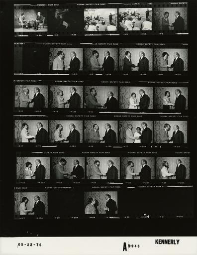 | Keywords: Ford A9946 NLGRF photo contact sheet (1976-05-22)(Gerald Ford Library).jpg White House Photographic Office WHPO is housed at the Gerald R Ford Presidential Library a branch of the National Archives and Records Administration NARA <br/><br/> This file is a 200 dpi photo contact sheet having images from roll of film A9946 of the August 9 1974 - January 20 1977 Gerald R Ford White House Photographic Office Series A0001-A9999 and B0001-B2886 photographs <br/><br/> The date on the photo contact sheet is the date the roll of film was processed not necessarily the date the photographs were taken See table below for additional details 1976-05-22 Gerald R Ford Presidential Library Image http //www fordlibrarymuseum gov/library/whphotos/A9946_NLGRF jpg A9946_NLGRF jpg from http //www fordlibrarymuseum gov/library/whphotos/19760522whpo pdf White House Photographs May 22 1976 of the http //www fordlibrarymuseum gov/Library/whphotos/whpo asp White House Photographic Collection page White House Photographic Office WHPO <br/> Creator David Hume Kennerly PD-USGov Institution Institution Gerald R Ford Presidential Library Table wikitable sortable + Photo contact sheet A9946 U S President Ford Administration Gerald R Ford Library Frame s Tone Subject proper Subject generic Names Geographic Location Photographer Date - 2A BW Trip to Oregon; Taping of One-on-One TV Interviews; Ted Bryant Interview; KOIN-TV CBS - Portland Oregon seated at small table under spotlight GRF Ted Bryant Portland OR Sheraton Portland Hotel - Washington Room Kennerly 1976-05-22 - 3A BW Trip to Oregon; Meeting with Oregon Statewide Editorial Board -Portland Oregon view of newspaper and woman's knees Portland OR Sheraton Portland Hotel - Presidential Suite Kennerly 1976-05-22 - 4A-5A BW Trip to Oregon; Meeting with Oregon Statewide Editorial Board; Television Adviser Mead - Portland Oregon GRF seated in front of room speaking to group; group seated in chairs around edge of room; media GRF Twenty-One Men Women Robert Mead Portland OR Sheraton Portland Hotel - Presidential Suite Kennerly 1976-05-22 - 6A-29A BW Trip to Oregon; Meeting with Oregon Statewide Editorial Board; Photo Ops -Portland Oregon GRF handshaking with individuals GRF Unidentified Men Women Portland OR Sheraton Portland Hotel - Presidential Suite Kennerly 1976-05-22 Gerald R Ford Presidential Library and Museum-cooperation PD-USGov Contact sheets by the Ford White House May 1976 Photographs by David Hume Kennerly from 1976 |
