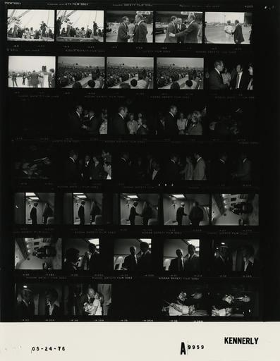 | Keywords: Ford A9959 NLGRF photo contact sheet (1976-05-24)(Gerald Ford Library).jpg White House Photographic Office WHPO is housed at the Gerald R Ford Presidential Library a branch of the National Archives and Records Administration NARA <br/><br/> This file is a 200 dpi photo contact sheet having images from roll of film A9959 of the August 9 1974 - January 20 1977 Gerald R Ford White House Photographic Office Series A0001-A9999 and B0001-B2886 photographs <br/><br/> The date on the photo contact sheet is the date the roll of film was processed not necessarily the date the photographs were taken See table below for additional details 1976-05-24 Gerald R Ford Presidential Library Image http //www fordlibrarymuseum gov/library/whphotos/A9959_NLGRF jpg A9959_NLGRF jpg from http //www fordlibrarymuseum gov/library/whphotos/19760524whpo pdf White House Photographs May 24 1976 of the http //www fordlibrarymuseum gov/Library/whphotos/whpo asp White House Photographic Collection page White House Photographic Office WHPO <br/> Creator David Hume Kennerly PD-USGov Institution Institution Gerald R Ford Presidential Library Table wikitable sortable + Photo contact sheet A9959 U S President Ford Administration Gerald R Ford Library Frame s Tone Subject proper Subject generic Names Geographic Location Photographer Date - 3-4 BW Trip to California-Visit to Tuna Boat the Theresa Janene GRF waving to crowd from top of gangplank GRF Crowd San Diego CA San Diego Harbor Kennerly 1976-05-24 - 5-6 BW Trip to California; Airport Departure; US Representative from California CA GRF handshaking with Mayor Wilson fr 5 joined by Rep Wilson fr 6 GRF Mayor Pete Wilson Rep Bob Wilson San Diego CA Lindbergh Field Kennerly 1976-05-24 - 7-8 BW Trip to California; Airport Arrival - Van Nuys California handshaking on tarmac GRF Van Nuys CA Van Nuys Airport Kennerly 1976-05-24 - 9-11 BW Trip to California; Van Nuys Airport Campaign Rally - Van Nuys California GRF at podium camera behind platform guests facing audience GRF Audience Platform Guests Van Nuys CA Van Nuys Airport Kennerly 1976-05-24 - 12-22 BW Trip to California; Van Nuys Airport Campaign Rally - Van Nuys California GRF handshaking mingling GRF Crowd Van Nuys CA Van Nuys Airport Kennerly 1976-05-24 - 23-28 BW Trip to California; Aboard Air Force One; Candice Bergen's Brother -Van Nuys California standing seated talking together; GRF Kris Bergen Van Nuys CA enroute Los Angeles International Airport Air Force One Kennerly 1976-05-24 - 29-33 BW Trip to California; Aboard Air Force One; Candice Bergen's Brother -Van Nuys California GRF standing talking to Bergen; talking to unidentified man GRF Kris Bergen Unidentified Man Van Nuys CA enroute Los Angeles International Airport Air Force One Kennerly 1976-05-24 - 34-37 BW Trip to California-Hotel Arrival GRF bending to kiss little girl with polio holding flowers GRF little Girl Los Angeles CA Hyatt House Hotel Kennerly 1976-05-24 Gerald R Ford Presidential Library and Museum-cooperation PD-USGov Contact sheets by the Ford White House May 1976 Photographs by David Hume Kennerly from 1976 |