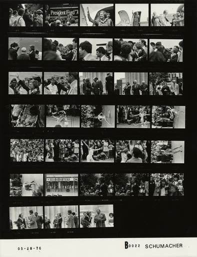 | Keywords: Ford B0022 NLGRF photo contact sheet (1976-05-27)(Gerald Ford Library).jpg White House Photographic Office WHPO is housed at the Gerald R Ford Presidential Library a branch of the National Archives and Records Administration NARA <br/><br/> This file is a 200 dpi photo contact sheet having images from roll of film B0022 of the August 9 1974 - January 20 1977 Gerald R Ford White House Photographic Office Series A0001-A9999 and B0001-B2886 photographs <br/><br/> The date on the photo contact sheet is the date the roll of film was processed not necessarily the date the photographs were taken See table below for additional details 1976-05-27 Gerald R Ford Presidential Library Image http //www fordlibrarymuseum gov/library/whphotos/B0022_NLGRF jpg B0022_NLGRF jpg from http //www fordlibrarymuseum gov/library/whphotos/19760527whpo pdf White House Photographs May 27 1976 of the http //www fordlibrarymuseum gov/Library/whphotos/whpo asp White House Photographic Collection page White House Photographic Office WHPO - Schumacher PD-USGov Institution Institution Gerald R Ford Presidential Library Table wikitable sortable + Photo contact sheet B0022 U S President Ford Administration Gerald R Ford Library Frame s Tone Subject proper Subject generic Names Geographic Location Photographer Date - 5 BW First Lady's Campaign Trip to Ohio; Arrival at Holiday Inn Cascade - Akron Ohio greeting handshaking Betty Ford Others Akron OH Holiday Inn Cascade -Outside Schumacher 1976-05-27 - 6 BW First Lady's Campaign Trip to Ohio; Reception for President Ford Committee PFC Supporters -Akron Ohio greeting handshaking talking; all not in every frame Betty Ford President Ford Committee PFC Supporters Akron OH Holiday Inn Cascade -Ballroom Schumacher 1976-05-28 - 7-8 BW First Lady's Campaign Trip to Ohio - Arrival at Wright-Patterson Air Force Base OH BF waving from open door of C-9 Jetstar Aircraft Betty Ford Dayton OH Wright-Patterson Air Force Base Schumacher 1976-05-28 - 9-16 BW First Lady's Campaign Trip to Ohio - Arrival at Wright-Patterson Air Force Base OH greeting handshaking talking; all not in every frame Betty Ford Air Force Personnel Others Crowd Dayton OH Wright-Patterson Air Force Base Schumacher 1976-05-28 - 17-18 BW First Lady's Campaign Trip to Ohio - Arrival for Campaign Rally at Courthouse Square Dayton OH greeting handshaking on steps of Courthouse Betty Ford Others Dayton OH Courthouse Square Schumacher 1976-05-28 - 19 BW First Lady's Campaign Trip to Ohio - Prior to Campaign Rally at Courthouse Square Dayton OH walking toward camera Others Dayton OH Courthouse Square Schumacher 1976-05-28 - 20 BW First Lady's Campaign Trip to Ohio - Prior to Campaign Rally at Courthouse Square Dayton OH sleeping in stroller Unidentified Child Dayton OH Courthouse Square Schumacher 1976-05-28 - 21-30 BW First Lady's Campaign Trip to Ohio - Public Performance at Courthouse Square Dayton OH performers from Dayton Ballet Company dancing in outdoor circle; others standing watching; all not in every frame Crowd Performers from Dayton Ballet Company Dayton OH Courthouse Square Schumacher 1976-05-28 - 31` BW First Lady's Campaign Trip to Ohio - Campaign Rally at Courthouse Square Dayton OH standing in windows looking at activities in Courthouse Square Campaign Workers Dayton OH Montgomery County Republican Headquarters - Outside Schumacher 1976-05-28 - 32-33 BW First Lady's Campaign Trip to Ohio - Campaign Rally at Courthouse Square Dayton OH BF speaking at microphone; others in background Betty Ford; Others Dayton OH Courthouse Square Schumacher 1976-05-28 - 34 BW First Lady's Campaign Trip to Ohio - Campaign Rally at Courthouse Square Dayton OH standing listening; all not in frame Crowd Dayton OH Courthouse Square Schumacher 1976-05-28 - 35-36 BW First Lady's Campaign Trip to Ohio - Campaign Rally at Courthouse Square Dayton OH US Representative from Ohio standing talking near microphone; others in background Betty Ford Unidentified Man Rep Tom Kindness ; Others Dayton OH Courthouse Square Schumacher 1976-05-28 - 37 BW First Lady's Campaign Trip to Ohio - Campaign Rally at Courthouse Square Dayton OH Montgomery County PFC Vice-Chairman Man speaking at microphone; BF standing to right; others in background Betty Ford Unidentified Man Fred Young ; Others Dayton OH Courthouse Square Schumacher 1976-05-28 Gerald R Ford Presidential Library and Museum-cooperation PD-USGov Contact sheets by the Ford White House May 1976 |
