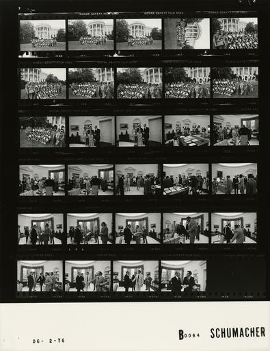 | Keywords: Ford B0064 NLGRF photo contact sheet (1976-06-02)(Gerald Ford Library).jpg White House Photographic Office WHPO is housed at the Gerald R Ford Presidential Library a branch of the National Archives and Records Administration NARA <br/><br/> This file is a 200 dpi photo contact sheet having images from roll of film B0064 of the August 9 1974 - January 20 1977 Gerald R Ford White House Photographic Office Series A0001-A9999 and B0001-B2886 photographs <br/><br/> The date on the photo contact sheet is the date the roll of film was processed not necessarily the date the photographs were taken See table below for additional details 1976-06-02 Gerald R Ford Presidential Library Image http //www fordlibrarymuseum gov/library/whphotos/B0064_NLGRF jpg B0064_NLGRF jpg from http //www fordlibrarymuseum gov/library/whphotos/19760602whpo pdf White House Photographs June 2 1976 of the http //www fordlibrarymuseum gov/Library/whphotos/whpo asp White House Photographic Collection page White House Photographic Office WHPO - Schumacher PD-USGov Institution Institution Gerald R Ford Presidential Library Table wikitable sortable + Photo contact sheet B0064 U S President Ford Administration Gerald R Ford Library Frame s Tone Subject proper Subject generic Names Geographic Location Photographer Date - 0-10 B Bicentennial Event standing kneeling on lawn posing; various angles and distances; White House and Truman Balcony in background Unidentified Public Liaison staffperson; Girl Scouts Leaders South Lawn Schumacher 1976-06-02 - 11-12 B Prior to Swearing In Ceremony of the Chairman of the Consumer Product Safety Commission -Spouse and Daughters standing talking GRF S John Byington Sally R Byington Nancy Lee Byington Barbara Ann Byington Oval Office Schumacher 1976-06-02 - 13 B Prior to Swearing In Ceremony of the Chairman of the Consumer Product Safety Commission -Spouse and Daughters standing talking; O'Donnell Ratchford agent on right of frame GRF S John Byington Sally R Byington Nancy Lee Byington Barbara Ann Byington O'Donnell John Ratchford Oval Office Schumacher 1976-06-02 - 14-17 B Following Swearing In Ceremony of the Chairman of the Consumer Product Safety Commission - Spouse and Daughters Parents Brothers Friends standing GRF leaning on chair back to camera; all not in every frame GRF S R Byington S J Byington T Byington D Coe Helen H Goldberg R Headlee M Headlee G Myers L Meyer D Nystrom C Nystrom R Redman C Redman T Scholler M Scholler H Simmons G Young M Sterlacci W Valis J Ratchford Oval Office Schumacher 1976-06-02 - 18 B Following Swearing In Ceremony of the Chairman of the Consumer Product Safety Commission - Spouse and Daughters Parents Brothers Friends standing O'Donnell directing traffic for photo opportunities with GRF GRF O'Donnell S R Byington S J Byington T Byington D Coe Helen H Goldberg R Headlee M Headlee G Myers L Meyer D Nystrom C Nystrom R Redman C Redman T Scholler M Scholler H Simmons G Young M Sterlacci W Valis J Ratchford Oval Office Schumacher 1976-06-02 - 19-28 B Photo Opportunity Following Swearing In Ceremony of the Chairman of the Consumer Product Safety Commission -Spouse and Daughters Parents Brothers Friends greeting handshaking; all not in every frame GRF S R Byington S J Byington T Byington D Coe Helen H Goldberg R Headlee M Headlee G Myers L Meyer D Nystrom C Nystrom R Redman C Redman T Scholler M Scholler H Simmons G Young Oval Office Schumacher 1976-06-02 Gerald R Ford Presidential Library and Museum-cooperation PD-USGov Contact sheets by the Ford White House June 1976 |