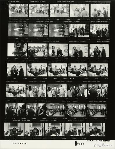 | Keywords: Ford B0098 NLGRF photo contact sheet (1976-06-04)(Gerald Ford Library).jpg White House Photographic Office WHPO is housed at the Gerald R Ford Presidential Library a branch of the National Archives and Records Administration NARA <br/><br/> This file is a 200 dpi photo contact sheet having images from roll of film B0098 of the August 9 1974 - January 20 1977 Gerald R Ford White House Photographic Office Series A0001-A9999 and B0001-B2886 photographs <br/><br/> The date on the photo contact sheet is the date the roll of film was processed not necessarily the date the photographs were taken See table below for additional details 1976-06-04 Gerald R Ford Presidential Library Image http //www fordlibrarymuseum gov/library/whphotos/B0098_NLGRF jpg B0098_NLGRF jpg from http //www fordlibrarymuseum gov/library/whphotos/19760604whpo pdf White House Photographs June 4 1976 of the http //www fordlibrarymuseum gov/Library/whphotos/whpo asp White House Photographic Collection page White House Photographic Office WHPO - Fitz-Patrick PD-USGov Institution Institution Gerald R Ford Presidential Library Table wikitable sortable + Photo contact sheet B0098 U S President Ford Administration Gerald R Ford Library Frame s Tone Subject proper Subject generic Names Geographic Location Photographer Date - 3-5 B Arrival for Farewell Visit by the King and Queen of Spain walking through gate; moving toward camera King Juan Carlos I Queen Sofia Kissinger; Others North Gate of White House Fitz-Patrick 1976-06-04 - 6-10 B Gift Exchange Prior to Farewell by the King and Queen of Spain standing talking; looking at gifts; various distances; all not in every frame GRF King Juan Carlos I Queen Sofia Kissinger Unidentified Man Second Floor - Yellow Oval Room Fitz-Patrick 1976-06-04 - 11-12 B Prior to Farewell by the King and Queen of Spain walking around limousine; moving toward camera; White House and Truman Balcony in background GRF King Juan Carlos I South Driveway Fitz-Patrick 1976-06-04 - 13-14 B Informal Press Conference Folloing Departure of the King and Queen of Spain standing talking; various distances; all not in frames GRF Media South Grounds Fitz-Patrick 1976-06-04 - 15-18 B Meeting with Steve Ford's Hosts from Newport Beach California greeting handshaking standing talking; GRF kissing Mrs MacAdam in 15 GRF Donal MacAdam Mr Donal MacAdam Oval Office Fitz-Patrick 1976-06-04 - 19-23 B Meeting with Steve Ford's Hosts from Newport Beach California seated talking on sofas near fireplace; taken over GRF's right shoulder GRF Donal MacAdam Mr Donal MacAdam Oval Office Fitz-Patrick 1976-06-04 - 24-29 B Arrival for Taped Interview with Representatives from Approximately 74 Ohio Radio Stations greeting handshaking standing talking; all not in frames GRF Ohio Radio Representatives State Dining Room Fitz-Patrick 1976-06-04 - 30-32 B Taped Interview with Representatives from Approximately 74 Ohio Radio Stations GRF at lectern speaking; others seated in arc on left of frame; all not in frames; medium range GRF Ohio Radio Representatives State Dining Room Fitz-Patrick 1976-06-04 - 33-37 B Taped Interview with Representatives from Approximately 74 Ohio Radio Stations GRF at lectern speaking; others seated in foreground; all not in frames; telephoto closeups from back of room; arm raised in frames 34-36 GRF Ohio Radio Representatives State Dining Room Fitz-Patrick 1976-06-04 Gerald R Ford Presidential Library and Museum-cooperation PD-USGov Contact sheets by the Ford White House June 1976 |