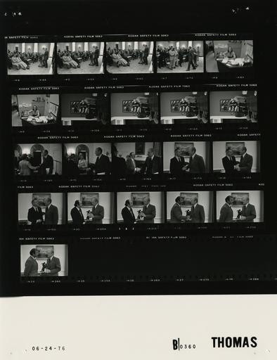 | Keywords: Ford B0360 NLGRF photo contact sheet (1976-06-24)(Gerald Ford Library).jpg White House Photographic Office WHPO is housed at the Gerald R Ford Presidential Library a branch of the National Archives and Records Administration NARA <br/><br/> This file is a 200 dpi photo contact sheet having images from roll of film B0360 of the August 9 1974 - January 20 1977 Gerald R Ford White House Photographic Office Series A0001-A9999 and B0001-B2886 photographs <br/><br/> The date on the photo contact sheet is the date the roll of film was processed not necessarily the date the photographs were taken See table below for additional details 1976-06-24 Gerald R Ford Presidential Library Image http //www fordlibrarymuseum gov/library/whphotos/B0360_NLGRF jpg B0360_NLGRF jpg from http //www fordlibrarymuseum gov/library/whphotos/19760624whpo pdf White House Photographs June 24 1976 of the http //www fordlibrarymuseum gov/Library/whphotos/whpo asp White House Photographic Collection page White House Photographic Office WHPO - Thomas PD-USGov Institution Institution Gerald R Ford Presidential Library Table wikitable sortable + Photo contact sheet B0360 U S President Ford Administration Gerald R Ford Library Frame s Tone Subject proper Subject generic Names Geographic Location Photographer Date - 4-7 BW Meeting to Discuss Public Opinion Trends Affecting Government Business and Society GRF at lectern speaking; others seated; various angles and distances; all not in every photograph GRF Louis Harris Participants in the Louis Harris Perspective Research Seminar State Dining Room Thomas 1976-06-24 - 8-9 BW Secretary to Ron Nessen seated at desk; 1st frame blurred Carol Montague Press Secretary's Office Thomas 1976-06-24 - 10-13 BW Bicentennial Gift Presentation standing posing in from of eagle and flag portrait; man and woman in military uniforms; identified as Marrs with the Little General Marrs Unidentifed Man Woman Unidentified Conference Room Thomas 1976-06-24 - 14-16 BW Meeting with Jweish Leaders standing talking greeting handshaking; all not in frames GRF L Bell H Blumberg J Cohen H Dobbs I Field G Glazer L Goldfine A Grass M Hassenfeld M Hecht Kaufman Klein Lansburgh J Lmeyerhoff Miller Norry Novack Robinson Russell Schacter Schwartz Strelitz Zacks Others Cabinet Room Thomas 1976-06-24 - 17-19 BW Meeting with Jweish Leaders - Presidents of Barton's Candy Company Haynes Furniture Company R G Barry Corporation greeting handshaking standing talking GRF Unidentified Man G Klein L Strelitz G Zacks Oval Office Thomas 1976-06-24 - 20-21 BW Meeting with Jewish Leaders - Presidents of Barton's Candy Company Haynes Furniture Company R G Barry Corporation greeting handshaking standing talking GRF Unidentified Man G Klein L Strelitz G Zacks Oval Office Thomas 1976-06-24 - 22-24 BW Meeting with Jweish Leaders - Presidents of Barton's Candy Company Haynes Furniture Company R G Barry Corporation greeting handshaking standing talking GRF Unidentified Man G Klein L Strelitz G Zacks Oval Office Thomas 1976-06-24 Gerald R Ford Presidential Library and Museum-cooperation PD-USGov Contact sheets by the Ford White House June 1976 |