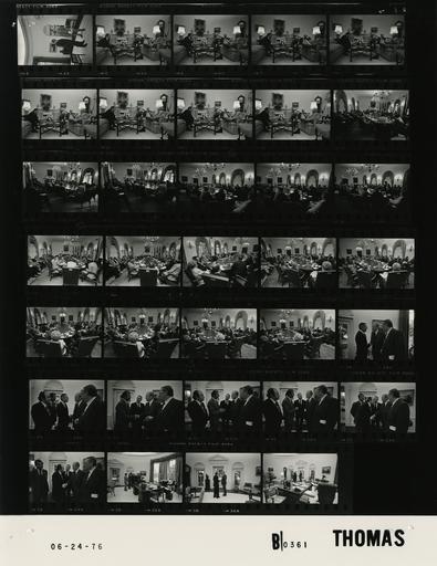 | Keywords: Ford B0361 NLGRF photo contact sheet (1976-06-24)(Gerald Ford Library).jpg White House Photographic Office WHPO is housed at the Gerald R Ford Presidential Library a branch of the National Archives and Records Administration NARA <br/><br/> This file is a 200 dpi photo contact sheet having images from roll of film B0361 of the August 9 1974 - January 20 1977 Gerald R Ford White House Photographic Office Series A0001-A9999 and B0001-B2886 photographs <br/><br/> The date on the photo contact sheet is the date the roll of film was processed not necessarily the date the photographs were taken See table below for additional details 1976-06-24 Gerald R Ford Presidential Library Image http //www fordlibrarymuseum gov/library/whphotos/B0361_NLGRF jpg B0361_NLGRF jpg from http //www fordlibrarymuseum gov/library/whphotos/19760624whpo pdf White House Photographs June 24 1976 of the http //www fordlibrarymuseum gov/Library/whphotos/whpo asp White House Photographic Collection page White House Photographic Office WHPO - Thomas PD-USGov Institution Institution Gerald R Ford Presidential Library Table wikitable sortable + Photo contact sheet B0361 U S President Ford Administration Gerald R Ford Library Frame s Tone Subject proper Subject generic Names Geographic Location Photographer Date - 4A BW Meeting with Chairman of the New York Republican State Committee standing talking GRF Richard Rosenbaum Oval Office Thomas 1976-06-24 - 5A-12A BW Meeting with Chairman of the New York Republican State Committee seated on sofas near fireplace talking GRF Richard Rosenbaum Cheney Oval Office Thomas 1976-06-24 - 13A-27A BW Meeting with Jewish Leaders seated around table GRF M Fisher L Bell H Blumberg J Cohen H Dobbs I Field G Glazer L Goldfine A Grass M Hassenfeld M Hecht Kaufman Klein Lansburgh J Lmeyerhoff Miller Norry Novack Robinson Russell Schacter Schwartz Strelitz Zacks Others Cabinet Room Thomas 1976-06-24 - 28A-35A BW Meeting with Jewish Leaders - Presidents of Barton's Candy Company Haynes Furniture Company R G Barry Corporation greeting handshaking standing talking; only GRF and Fisher in all frames GRF M Fisher G Klein L Strelitz G Zacks Lissy Oval Office Thomas 1976-06-24 - 36A-37 BW Meeting with Jewish Leaders - Presidents of Barton's Candy Company Haynes Furniture Company R G Barry Corporation standing talking near desk; long shots from across room GRF Unidentified Man G Klein L Strelitz G Zacks Oval Office Thomas 1976-06-24 Gerald R Ford Presidential Library and Museum-cooperation PD-USGov Contact sheets by the Ford White House June 1976 |