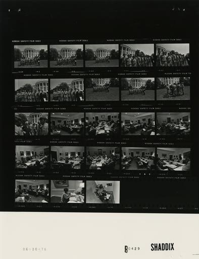 | Keywords: Ford B0429 NLGRF photo contact sheet (1976-06-30)(Gerald Ford Library).jpg White House Photographic Office WHPO is housed at the Gerald R Ford Presidential Library a branch of the National Archives and Records Administration NARA <br/><br/> This file is a 200 dpi photo contact sheet having images from roll of film B0429 of the August 9 1974 - January 20 1977 Gerald R Ford White House Photographic Office Series A0001-A9999 and B0001-B2886 photographs <br/><br/> The date on the photo contact sheet is the date the roll of film was processed not necessarily the date the photographs were taken See table below for additional details 1976-06-30 Gerald R Ford Presidential Library Image http //www fordlibrarymuseum gov/library/whphotos/B0429_NLGRF jpg B0429_NLGRF jpg from http //www fordlibrarymuseum gov/library/whphotos/19760630whpo pdf White House Photographs June 30 1976 of the http //www fordlibrarymuseum gov/Library/whphotos/whpo asp White House Photographic Collection page White House Photographic Office WHPO - Shaddix PD-USGov Institution Institution Gerald R Ford Presidential Library Table wikitable sortable + Photo contact sheet B0429 U S President Ford Administration Gerald R Ford Library Frame s Tone Subject proper Subject generic Names Geographic Location Photographer Date - 3-11 BW Bicentennial Gift Presentation standing posing; various angles and distances; all not in every frame; White House and Truman Balcony in background Mitler Boy Scouts South Lawn Shaddix 1976-06-30 - 12-13 BW Bicentennial Gift Presentation standing in circle talking; all not in frames; White House and Truman Balcony in background Mitler Boy Scouts South Lawn Shaddix 1976-06-30 - 14-23 BW Unidentified Business Meeting Seated around table and in chairs along walls; various angles and distances; all not in every frame Unidentified Group of Men Women Roosevelt Room Shaddix 1976-06-30 - 24 BW Unidentified White House Staff seated at desk working looking at log book Unidentified staff Woman Unidentified White House Office Shaddix 1976-06-30 - 25 BW Unidentified White House Staff boy seated in chair smiling; officer standing next to boy and desk Unidentified Federal Protective Officer FPO Unidentified Young Boy Unidentified White House Office Shaddix 1976-06-30 Gerald R Ford Presidential Library and Museum-cooperation PD-USGov Contact sheets by the Ford White House June 1976 |