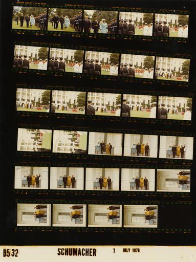 | Keywords: Ford B0532 NLGRF photo contact sheet (1976-07-07)(Gerald Ford Library).jpg White House Photographic Office WHPO is housed at the Gerald R Ford Presidential Library a branch of the National Archives and Records Administration NARA <br/><br/> This file is a 200 dpi photo contact sheet having images from roll of film B0532 of the August 9 1974 - January 20 1977 Gerald R Ford White House Photographic Office Series A0001-A9999 and B0001-B2886 photographs <br/><br/> The date on the photo contact sheet is the date the roll of film was processed not necessarily the date the photographs were taken See table below for additional details 1976-07-07 Gerald R Ford Presidential Library Image http //www fordlibrarymuseum gov/library/whphotos/B0532_NLGRF jpg B0532_NLGRF jpg from http //www fordlibrarymuseum gov/library/whphotos/19760707whpo pdf White House Photographs July 7 1976 of the http //www fordlibrarymuseum gov/Library/whphotos/whpo asp White House Photographic Collection page White House Photographic Office WHPO - Schumacher PD-USGov Institution Institution Gerald R Ford Presidential Library Table wikitable sortable + Photo contact sheet B0532 U S President Ford Administration Gerald R Ford Library Frame s Tone Subject proper Subject generic Names Geographic Location Photographer Date - 1-3 Color State Arrival Cerremony for Queen Elizabeth II and Prince Philip GRF QEII Aide and Captain reviewing Honor Guard; all not in frames; moving toward camera GRF Queen Elizabeth II; Captain of the Honor Guard British Military Aide Honor Guard South Lawn Schumacher 1976-07-07 - 4-9 Color State Arrival Cerremony for Queen Elizabeth II and Prince Philip GRF and QEII standing on lectern; band marching in front of them; crowd on either side of frame; trumpeters on Truman Balcony; White House in background; long shots from Lawn GRF Queen Elizabeth II Herald Trumpeters Marine Band Crowd South Lawn Schumacher 1976-07-07 - 10-17 Color State Arrival Cerremony for Queen Elizabeth II and Prince Philip GRF and QEII standing on lectern; watching band not seen ; crowd on either side of frame; trumpeters on Truman Balcony; White House in background; long shots from Lawn GRF Queen Elizabeth II Herald Trumpeters Crowd South Lawn Schumacher 1976-07-07 - 18-29 Color State Arrival Cerremony for Queen Elizabeth II and Prince Philip on balcony; standing talking waving posing GRF Queen Elizabeth II Betty Ford Prince Philip Truman Balcony Schumacher 1976-07-07 Gerald R Ford Presidential Library and Museum-cooperation PD-USGov Contact sheets by the Ford White House July 1976 |