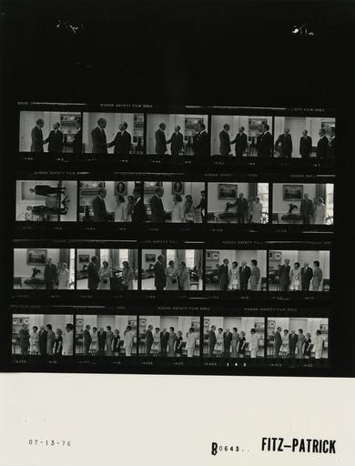 | Keywords: Ford B0643 NLGRF photo contact sheet (1976-07-13)(Gerald Ford Library).jpg White House Photographic Office WHPO is housed at the Gerald R Ford Presidential Library a branch of the National Archives and Records Administration NARA <br/><br/> This file is a 200 dpi photo contact sheet having images from roll of film B0643 of the August 9 1974 - January 20 1977 Gerald R Ford White House Photographic Office Series A0001-A9999 and B0001-B2886 photographs <br/><br/> The date on the photo contact sheet is the date the roll of film was processed not necessarily the date the photographs were taken See table below for additional details 1976-07-13 Gerald R Ford Presidential Library Image http //www fordlibrarymuseum gov/library/whphotos/B0643_NLGRF jpg B0643_NLGRF jpg from http //www fordlibrarymuseum gov/library/whphotos/19760713whpo pdf White House Photographs July 13 1976 of the http //www fordlibrarymuseum gov/Library/whphotos/whpo asp White House Photographic Collection page White House Photographic Office WHPO - Fitz-Patrick PD-USGov Institution Institution Gerald R Ford Presidential Library Table wikitable sortable + Photo contact sheet B0643 U S President Ford Administration Gerald R Ford Library Frame s Tone Subject proper Subject generic Names Geographic Location Photographer Date - 3-4 BW Former Congressman from Wyoming and Grandson of Former President William Henry Harrison greeting handshaking standing talking GRF William Henry Harrison III Oval Office Fitz-Patrick 1976-07-13 - 5-7 BW Former Congressman from Wyoming and Grandson of Former President William Henry Harrison; Great-Grandson of Former President William Henry Harrison; White House Curator greeting handshaking standing talking GRF William Henry Harrison III; William Henry Harrison IV Clement Conger Oval Office Fitz-Patrick 1976-07-13 - 8 BW Former Congressman from Wyoming and Grandson of Former President William Henry Harrison standing talking GRF William Henry Harrison III Oval Office Fitz-Patrick 1976-07-13 - 9-10 BW Presentation of Frederic Remington bronze sculpture The Bronco Buster standing talking; Conger in 1st frame only GRF Virginia Hatfield Louise Hatfield; Clement Conger Oval Office Fitz-Patrick 1976-07-13 - 11-13 BW Presentation of Frederic Remington bronze sculpture The Bronco Buster standing talking posing near sculpture GRF Virginia Hatfield Louise Hatfield Oval Office Fitz-Patrick 1976-07-13 - 14-15 BW Presentation of Frederic Remington bronze sculpture The Bronco Buster standing talking near desk GRF Virginia Hatfield Louise Hatfield Oval Office Fitz-Patrick 1976-07-13 - 16-17 BW Farewell Visit by Departing Special Assistant for Human Resources; Wife and Son standing talking GRF Ted Marrs Anette Marrs James W Marrs Oval Office Fitz-Patrick 1976-07-13 - 18-22 BW Farewell Visit by Departing Special Assistant for Human Resources; Wife and Son; Secretary to Marrs; Director Office of Public Liaison standing talking GRF Ted Marrs Anette Marrs James W Marrs; Velma Shelton; Baroody Oval Office Fitz-Patrick 1976-07-13 Gerald R Ford Presidential Library and Museum-cooperation PD-USGov Contact sheets by the Ford White House July 1976 |