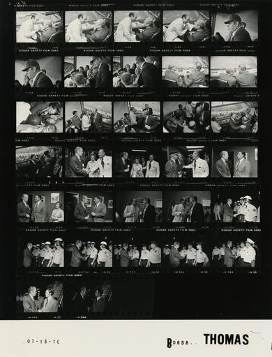 | Keywords: Ford B0658 NLGRF photo contact sheet (1976-07-13)(Gerald Ford Library).jpg White House Photographic Office WHPO is housed at the Gerald R Ford Presidential Library a branch of the National Archives and Records Administration NARA <br/><br/> This file is a 200 dpi photo contact sheet having images from roll of film B0658 of the August 9 1974 - January 20 1977 Gerald R Ford White House Photographic Office Series A0001-A9999 and B0001-B2886 photographs <br/><br/> The date on the photo contact sheet is the date the roll of film was processed not necessarily the date the photographs were taken See table below for additional details 1976-07-13 Gerald R Ford Presidential Library Image http //www fordlibrarymuseum gov/library/whphotos/B0658_NLGRF jpg B0658_NLGRF jpg from http //www fordlibrarymuseum gov/library/whphotos/19760713whpo pdf White House Photographs July 13 1976 of the http //www fordlibrarymuseum gov/Library/whphotos/whpo asp White House Photographic Collection page White House Photographic Office WHPO - Thomas PD-USGov Institution Institution Gerald R Ford Presidential Library Table wikitable sortable + Photo contact sheet B0658 U S President Ford Administration Gerald R Ford Library Frame s Tone Subject proper Subject generic Names Geographic Location Photographer Date - 5A-8A BW Trip to Pennsylvania -Major League Baseball All-Star Game - Former Professional Baseball Player seated; GRF in chair Garagiola on table gesturing talking; field in background GRF Joe Garagiola Philadelphia PA Veterans Memorial Stadium - Philadelphia Phillies Owner's Upper Deck Suite Thomas 1976-07-13 - 9A-11A BW Trip to Pennsylvania -Major League Baseball All-Star Game - Former Professional Baseball Player seated wearing baseball cap smoking cigarette Unidentified Man Philadelphia PA Veterans Memorial Stadium - Philadelphia Phillies Owner's Upper Deck Suite Thomas 1976-07-13 - 11A-12A BW Trip to Pennsylvania -Major League Baseball All-Star Game most talking laughing; Greenspan seated in background watching game not seen ; 1 man wearing Phillies Cap; all not in both frames Cheney Barrett Greenspan Others Philadelphia PA Veterans Memorial Stadium - Philadelphia Phillies Owner's Upper Deck Suite Thomas 1976-07-13 - 13A-14A BW Trip to Pennsylvania -Major League Baseball All-Star Game - Commissioner of Major League Baseball seated talking watching game; backs to camera GRF Bowie Kuhn Philadelphia PA Veterans Memorial Stadium - Philadelphia Phillies Owner's Upper Deck Suite Thomas 1976-07-13 - 15A BW Trip to Pennsylvania -Major League Baseball All-Star Game - Commissioner of Major League Baseball; Retired Chicago Cubs Baseball Player seated talking watching game; Banks' back to camera GRF Bowie Kuhn Ernie Banks Philadelphia PA Veterans Memorial Stadium - Philadelphia Phillies Owner's Upper Deck Suite Thomas 1976-07-13 - 16A-20A BW Trip to Pennsylvania -Prior to Early Departure From Major League Baseball All-Star Game - Commissioner of Major League Baseball handshaking talking GRF saying goodbye; various angles and distances; all not in every frame GRF Bowie Kuhn Others Philadelphia PA Veterans Memorial Stadium - Philadelphia Phillies Owner's Upper Deck Suite Thomas 1976-07-13 - 21A-22A BW Trip to Pennsylvania - Prior to Early Departure From Major League Baseball All-Star Game - Owner Philadelphia Phillies Baseball Club handshaking talking GRF saying goodbye GRF Unidentified Man Woman Mr Mrs Robert Carpenter Philadelphia PA Veterans Memorial Stadium -Philadelphia Phillies Owner's Upper Deck Suite Thomas 1976-07-13 - 23A BW Trip to Pennsylvania -Prior to Early Departure From Major League Baseball All-Star Game - Owner Philadelphia Phillies Baseball Club GRF and Man standing talking; Barrett nearby in uniform GRF Unidentified Man Robert Carpenter ; Barrett Philadelphia PA Veterans Memorial Stadium - Philadelphia Phillies Owner's Upper Deck Suite Thomas 1976-07-13 - 24A-26A BW Trip to Pennsylvania -Prior to Early Departure From Major League Baseball All-Star Game - Mayor of Philadelphia GRF and Rizzo standing talking handshaking; woman standing nearby in 2nd frame only GRF Mayor Frank Rizzo; Unidentified Woman Mrs Rizzo Philadelphia PA Veterans Memorial Stadium - Philadelphia Phillies Owner's Upper Deck Suite Thomas 1976-07-13 - 27A-28A BW Trip to Pennsylvania -Prior to Early Departure From Major League Baseball All-Star Game - Former Professional Baseball Player standing talking Joe Garagiola Jack Ford Philadelphia PA Veterans Memorial Stadium - Philadelphia Phillies Owner's Upper Deck Suite Thomas 1976-07-13 - 29A-34A BW Trip to Pennsylvania -Prior to Departure for Andrews Air Force Base handshaking; GRF thanking officers' all not in every frame GRF Police Officers Philadelphia PA Philadelphia International Airport Thomas 1976-07-13 - 35A-36A BW Trip to Pennsylvania - Prior to Departure for Andrews Air Force Base handshaking standing talking; steps to Air Force One in picture GRF Unidentified Man Philadelphia PA Philadelphia International Airport Thomas 1976-07-13 Gerald R Ford Presidential Library and Museum-cooperation PD-USGov Contact sheets by the Ford White House July 1976 |