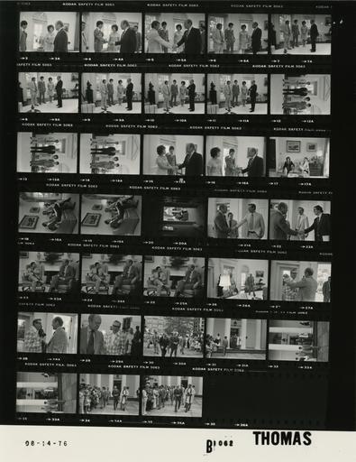 Keywords: Ford B1062 NLGRF photo contact sheet (1976-08-13)(Gerald Ford Library).jpg White House Photographic Office WHPO is housed at the Gerald R Ford Presidential Library a branch of the National Archives and Records Administration NARA <br/><br/> This file is a 200 dpi photo contact sheet having images from roll of film B1062 of the August 9 1974 - January 20 1977 Gerald R Ford White House Photographic Office Series A0001-A9999 and B0001-B2886 photographs <br/><br/> The date on the photo contact sheet is the date the roll of film was processed not necessarily the date the photographs were taken See table below for additional details 1976-08-13 Gerald R Ford Presidential Library Image http //www fordlibrarymuseum gov/library/whphotos/B1062_NLGRF jpg B1062_NLGRF jpg from http //www fordlibrarymuseum gov/library/whphotos/19760813whpo pdf White House Photographs August 13 1976 of the http //www fordlibrarymuseum gov/Library/whphotos/whpo asp White House Photographic Collection page White House Photographic Office WHPO - Thomas PD-USGov Institution Institution Gerald R Ford Presidential Library Table wikitable sortable + Photo contact sheet B1062 U S President Ford Administration Gerald R Ford Library Frame s Tone Subject proper Subject generic Names Geographic Location Photographer Date - 3A-11A BW Farewell Handshake with Departing Secret Service Agent greeting handshaking standing talking; various angles and distances; all not in every frame GRF James Sharon Highet; David Highet Oval Office Thomas 1976-08-13 - 12A-14A BW Farewell Handshake with Departing Secret Service Agent standing posing GRF James Sharon Highet; David Highet Oval Office Thomas 1976-08-13 - 15A-16A BW Farewell Handshake with Departing Secret Service Agent handshaking saying goodbye GRF Sharon Highet; David Highet Oval Office Thomas 1976-08-13 - 17A BW Secretary of Housing and Urban Development HUD sitting talking Cannon C Hills Scheduling and Advance Office Thomas 1976-08-13 - 18A-20A BW Director of the Central Intelligence Agency CIA seated talking; last frame ling shot through doorway Scowcroft Bush Scheduling and Advance Office Kennerly 1976-08-13 - 21A-22A BW Prior to Chicago Tribune Interview greeting handshaking all not in frames GRF Aldo Beckman William Niekirk Jim Coates Oval Office Kennerly 1976-08-14 - 23A-25A BW Chicago Tribune Interview seated near fireplace; close ups GRF Aldo Beckman Oval Office Kennerly 1976-08-14 - 26A BW walking talking; GRF with hands in pockets; Barrett in T-Shirt GRF Barrett Oval Office Schumacher 1976-08-14 - 27A-29A BW Meeting with Governor of Ohio OH greeting handshaking standing talking GRF Gov James Rhodes Oval Office Schumacher 1976-08-14 - 30A BW Arrival for Sunday Worship Services - Head Usher talking walking toward camera; others in background GRF Donald Gray Others Washington DC Lafayette Square - St John's Episcopal Church Kennerly 1976-08-15 - 31A-35A BW Following Sunday Worship Services - Assistant Minister talking walking toward limousine; others in background GRF Rev Peter Larsen Others Washington DC Lafayette Square - St John's Episcopal Church Kennerly 1976-08-15 Gerald R Ford Presidential Library and Museum-cooperation PD-USGov Contact sheets by the Ford White House August 1976 |
