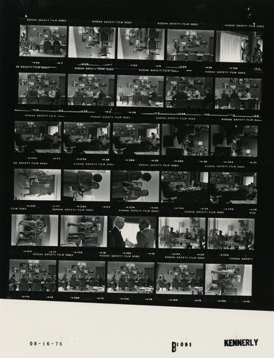 | Keywords: Ford B1091 NLGRF photo contact sheet (1976-08-16)(Gerald Ford Library).jpg White House Photographic Office WHPO is housed at the Gerald R Ford Presidential Library a branch of the National Archives and Records Administration NARA <br/><br/> This file is a 200 dpi photo contact sheet having images from roll of film B1091 of the August 9 1974 - January 20 1977 Gerald R Ford White House Photographic Office Series A0001-A9999 and B0001-B2886 photographs <br/><br/> The date on the photo contact sheet is the date the roll of film was processed not necessarily the date the photographs were taken See table below for additional details 1976-08-16 Gerald R Ford Presidential Library Image http //www fordlibrarymuseum gov/library/whphotos/B1091_NLGRF jpg B1091_NLGRF jpg from http //www fordlibrarymuseum gov/library/whphotos/19760816whpo pdf White House Photographs August 16 1976 of the http //www fordlibrarymuseum gov/Library/whphotos/whpo asp White House Photographic Collection page White House Photographic Office WHPO <br/> Creator David Hume Kennerly PD-USGov Institution Institution Gerald R Ford Presidential Library Table wikitable sortable + Photo contact sheet B1091 U S President Ford Administration Gerald R Ford Library Frame s Tone Subject proper Subject generic Names Geographic Location Photographer Date - 1A-6A BW Trip to Kansas City Missouri - Convention - Convention Strategy Meeting seated around table; only GRF Hartmann and Penny facing camera; GRF caotless without tie GRF Hartmann Orben Penny Douglas Smith Kansas City MO Crown Center Hotel - President's Suite - Office Kennerly 1976-08-16 - 7A-9A BW Trip to Kansas City Missouri - Convention standing in front of table reading documents; various distances GRF Kansas City MO Crown Center Hotel - President's Suite - Office Kennerly 1976-08-16 - 10A BW Trip to Kansas City Missouri - Convention standing at window pulling drapes back looking out GRF Kansas City MO Crown Center Hotel - President's Suite - Office Kennerly 1976-08-16 - 11A-14A BW Trip to Kansas City Missouri - Convention - Meeting Minnesota Delegates to the Republican Presidential Convention seated around table talking; various angles and distances GRF Glenn Annexstad Verne Long Gene Smith Robert Jackson Robert Barry Ancher Nelson Kansas City MO Crown Center Hotel - President's Suite - Office Kennerly 1976-08-16 - 15A-17A BW Trip to Kansas City Missouri - Convention standing near desk talking walking in 2nd frame GRF Cheney Kansas City MO Crown Center Hotel - President's Suite - Office Kennerly 1976-08-16 - 18A BW Trip to Kansas City Missouri - Convention standing talking; close up profile GRF Schmults Kansas City MO Crown Center Hotel - President's Suite - Office Kennerly 1976-08-16 - 19A-20A BW Trip to Kansas City Missouri - Convention seated talking; all not in frames Betty Ford Janet Ford; Ellen Ford; Barbara Ford Kansas City MO Crown Center Hotel - President's Suite Kennerly 1976-08-16 - 21A-23A BW Trip to Kansas City Missouri - Convention talking moving around room; embracing in 2nd frame Betty Ford Susan Ford Kansas City MO Crown Center Hotel - President's Suite Kennerly 1976-08-16 - 24A-28A BW Trip to Kansas City Missouri - Convention - Convention Strategy Meeting seated around table talking; various angles and distances; all not in every frame; O'Donnell in last two frames coatless GRF Marsh Cheney Teeter Stuart Spencer Others; O'Donnell Kansas City MO Crown Center Hotel - President's Suite - Office Kennerly 1976-08-16 - 29A-30A BW Trip to Kansas City Missouri - Convention seated at desk reading documents; feet on desk smoking pipe GRF Kansas City MO Crown Center Hotel - President's Suite - Office Kennerly 1976-08-16 Gerald R Ford Presidential Library and Museum-cooperation PD-USGov Contact sheets by the Ford White House August 1976 Photographs by David Hume Kennerly from 1976 |
