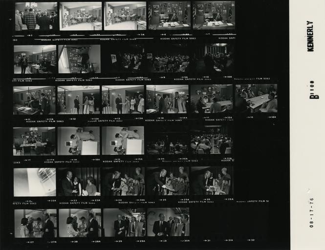 | Keywords: Ford B1108 NLGRF photo contact sheet (1976-08-17)(Gerald Ford Library).jpg White House Photographic Office WHPO is housed at the Gerald R Ford Presidential Library a branch of the National Archives and Records Administration NARA <br/><br/> This file is a 200 dpi photo contact sheet having images from roll of film B1108 of the August 9 1974 - January 20 1977 Gerald R Ford White House Photographic Office Series A0001-A9999 and B0001-B2886 photographs <br/><br/> The date on the photo contact sheet is the date the roll of film was processed not necessarily the date the photographs were taken See table below for additional details 1976-08-17 Gerald R Ford Presidential Library Image http //www fordlibrarymuseum gov/library/whphotos/B1108_NLGRF jpg B1108_NLGRF jpg from http //www fordlibrarymuseum gov/library/whphotos/19760817whpo pdf White House Photographs August 17 1976 of the http //www fordlibrarymuseum gov/Library/whphotos/whpo asp White House Photographic Collection page White House Photographic Office WHPO <br/> Creator David Hume Kennerly PD-USGov Institution Institution Gerald R Ford Presidential Library Table wikitable sortable + Photo contact sheet B1108 U S President Ford Administration Gerald R Ford Library Frame s Tone Subject proper Subject generic Names Geographic Location Photographer Date - 1-3 BW Trip to Kansas City Missouri - Convention - Meeting with Ford Regional Whips for the Republican National Convention standing talking in 1st frame; seated around table talking in others; all may not be in frames GRF R Rosenbaum F Biebel E Hillman T Kean R Ogilvie E Welden K McGough K McNamara W McGlaughlin T Milligan R Forsythe Sens Fong Beall Griffin Tower; Rep Michel; Baker White Timmons C Coray Morton Kansas City MO Crown Center Hotel - President's Suite - Office Kennerly 1976-08-17 - 4-7 BW Trip to Kansas City Missouri - Convention seateed behind desk; talking on telephone; Cheney lighting cigarette in 1 frame GRF Cheney Kansas City MO Crown Center Hotel - President's Suite -Office Kennerly 1976-08-17 - 8-10 BW Trip to Kansas City Missouri - Convention - Meeting with State and Regional Floor Whips for the Republican National Convention GRF at lectern speaking others seated; various angles and distances; all not in frames GRF State Regional Floor Whips Kansas City MO Center Hotel -Centennial Room A Kennerly 1976-08-17 - 11 BW Trip to Kansas City Missouri - Convention standing talking near desk GRF O'Donnell Kansas City MO Crown Center Hotel - President's Suite - Office Kennerly 1976-08-17 - 12-14 BW Trip to Kansas City Missouri - Convention - Meeting with Mississippi Delegates and Alternates to the Republican National Convention greeting handshaking; all not in frames GRF W Dease G Beal D K Shanks J T Long J L Baker J K Green J Monsour; James Baker Kansas City MO Crown Center Hotel - President's Suite - Office Kennerly 1976-08-17 - 15-16 BW Trip to Kansas City Missouri - Convention - Meeting with Mississippi Delegates and Alternates to the Republican National Convention seated around table; all may not be in frames GRF W Dease G Beal D K Shanks J T Long J L Baker J K Green J Monsour; James Baker Kansas City MO Crown Center Hotel - President's Suite - Office Kennerly 1976-08-17 - 17 BW Trip to Kansas City Missouri - Convention - Convention Strategy Meeting seated around table GRF Hartmann Orben Penny Douglas Smith Kansas City MO Crown Center Hotel - President's Suite - Office Kennerly 1976-08-17 - 18-19 BW Trip to Kansas City Missouri - Convention talking; O'Donnell seated at desk; man kneeling on floor in front of desk O'Donnell Unidentified Man Kansas City MO Crown Center Hotel - President's Suite Kennerly 1976-08-17 - 20-21 BW Trip to Kansas City Missouri - Convention - Delegates and Alternates from Illinois to the Republican National Convention GRF at lectern speaking others in foreground; long shot from back of room GRF Delegates Alternates from Illinois Kansas City MO Hilton Plaza Inn - Regency Room Kennerly 1976-08-17 - 22 BW Kennerly 1976-08-17 - 23-26 BW Trip to Kansas City Missouri - Convention - Delegates and Alternates from Illinois to the Republican National Convention standing talking to small groups; all not in frames GRF Delegates Alternates from Illinois Kansas City MO Hilton Plaza Inn - Regency Room Kennerly 1976-08-17 - 27-28 BW Trip to Kansas City Missouri - Convention standing talking handshaking GRF Unidentified women Kansas City MO Hilton Plaza Inn Kennerly 1976-08-17 - 29-30 BW Trip to Kansas City Missouri - Convention walking through steam tunnel GRF Nessen Others Kansas City MO Hilton Plaza Inn Kennerly 1976-08-17 Gerald R Ford Presidential Library and Museum-cooperation PD-USGov Contact sheets by the Ford White House August 1976 Photographs by David Hume Kennerly from 1976 |