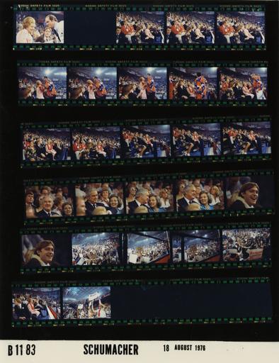 | Keywords: Ford B1183 NLGRF photo contact sheet (1976-08-18)(Gerald Ford Library).jpg White House Photographic Office WHPO is housed at the Gerald R Ford Presidential Library a branch of the National Archives and Records Administration NARA <br/><br/> This file is a 200 dpi photo contact sheet having images from roll of film B1183 of the August 9 1974 - January 20 1977 Gerald R Ford White House Photographic Office Series A0001-A9999 and B0001-B2886 photographs <br/><br/> The date on the photo contact sheet is the date the roll of film was processed not necessarily the date the photographs were taken See table below for additional details 1976-08-18 Gerald R Ford Presidential Library Image http //www fordlibrarymuseum gov/library/whphotos/B1183_NLGRF jpg B1183_NLGRF jpg from http //www fordlibrarymuseum gov/library/whphotos/19760818whpo pdf White House Photographs August 18 1976 of the http //www fordlibrarymuseum gov/Library/whphotos/whpo asp White House Photographic Collection page White House Photographic Office WHPO - Schumacher PD-USGov Institution Institution Gerald R Ford Presidential Library Table wikitable sortable + Photo contact sheet B1183 U S President Ford Administration Gerald R Ford Library Frame s Tone Subject proper Subject generic Names Geographic Location Photographer Date - 2A Color Trip to Kansas City Missouri - Convention - 4th Session of the Republican National Convention BF seated; Reporter leaning toward BF talking; Jack in background Betty Ford; Reporter Media Jack Ford Kansas City MO Kemper Arena Schumacher 1976-08-18 - 3A Color Schumacher 1976-08-18 - 4A-6A Color Trip to Kansas City Missouri - Convention - 4th Session of the Republican National Convention seated listening; all not in frames Steve Ford Betty Ford Susan Ford Jack Ford Mike Gayle Ford Tom Janet Ford Dick Ellen Ford Others Kansas City MO Kemper Arena Schumacher 1976-08-18 - 7A-11A Color Trip to Kansas City Missouri - Convention - 4th Session of the Republican National Convention all seated; BF standing in 1st four frames embracing man in some; Men standing near BF wearing red white and blue cow pattern shirts; all not in every frame Steve Ford Betty Ford Susan Ford Jack Ford Unidentified Men Kansas City MO Kemper Arena Schumacher 1976-08-18 - 12A-16A Color Trip to Kansas City Missouri - Convention - 4th Session of the Republican National Convention seated listening laughing; all not in every frame Steve Ford Betty Ford Susan Ford Jack Ford Unidentified Men Kansas City MO Kemper Arena Schumacher 1976-08-18 - 17A-20A Color Trip to Kansas City Missouri - Convention - 4th Session of the Republican National Convention seated talking laughing; others in background; head and shoulder close ups Mr Mrs John Connally Kansas City MO Kemper Arena Schumacher 1976-08-18 - 21A-22A Color Trip to Kansas City Missouri - Convention - 4th Session of the Republican National Convention seated smiling laughing; wearing lei; close up portraits Jack Ford Kansas City MO Kemper Arena Schumacher 1976-08-18 - 23A-26A Color Trip to Kansas City Missouri - Convention - Delegate Demonstration at the 4th Session of the Republican National Convention standing applauding whooping; holding signs; taken from upper level Crowd Kansas City MO Kemper Arena Schumacher 1976-08-18 - 27A Color Trip to Kansas City Missouri - Convention - Delegate Demonstration at the 4th Session of the Republican National Convention seated listening Steve Ford Betty Ford Susan Ford Jack Ford Mike Ford Others Kansas City MO Kemper Arena Schumacher 1976-08-18 - 28A Color Trip to Kansas City Missouri - Convention - Delegate Demonstration at the 4th Session of the Republican National Convention standing applauding whooping; holding signs; taken from upper level Crowd Kansas City MO Kemper Arena Schumacher 1976-08-18 Gerald R Ford Presidential Library and Museum-cooperation PD-USGov Contact sheets by the Ford White House August 1976 |