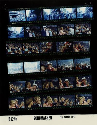 | Keywords: Ford B1295 NLGRF photo contact sheet (1976-08-18)(Gerald Ford Library).jpg White House Photographic Office WHPO is housed at the Gerald R Ford Presidential Library a branch of the National Archives and Records Administration NARA <br/><br/> This file is a 200 dpi photo contact sheet having images from roll of film B1295 of the August 9 1974 - January 20 1977 Gerald R Ford White House Photographic Office Series A0001-A9999 and B0001-B2886 photographs <br/><br/> The date on the photo contact sheet is the date the roll of film was processed not necessarily the date the photographs were taken See table below for additional details 1976-08-18 Gerald R Ford Presidential Library Image http //www fordlibrarymuseum gov/library/whphotos/B1295_NLGRF jpg B1295_NLGRF jpg from http //www fordlibrarymuseum gov/library/whphotos/19760818whpo pdf White House Photographs August 18 1976 of the http //www fordlibrarymuseum gov/Library/whphotos/whpo asp White House Photographic Collection page White House Photographic Office WHPO - Schumacher PD-USGov Institution Institution Gerald R Ford Presidential Library Table wikitable sortable + Photo contact sheet B1295 U S President Ford Administration Gerald R Ford Library Frame s Tone Subject proper Subject generic Names Geographic Location Photographer Date - 2-7 Color Trip to Kansas City Missouri - Convention - Arrival at the Radisson Meuhlebach Hotel GRF and BF standing waving; stepping toward vehicle; limousine movingin last frame; various angles and distances; all not in every frame GRF Betty Ford Keiser Secret Service Crowd Kansas City MO Radisson Meuhlebach Hotel - Outside Schumacher 1976-08-18 - 8-9 Color Trip to Kansas City Missouri - Convention - Ford Family at the Republican National Convention standing singing; Steve Ford wearing cowboy hat Betty Ford Susan Ford Steve Ford Jack Ford Others Kansas City MO Kemper Arena Schumacher 1976-08-18 - 10 Color Trip to Kansas City Missouri - Convention - Ford Family at the Republican National Convention handshaking talking Betty Ford Unidentified Man Kansas City MO Kemper Arena Schumacher 1976-08-18 - 11-16 Color Trip to Kansas City Missouri - Convention - Ford Family at the Republican National Convention seated listening talking; BF weaing lei various angles; all not in every frame Nelson Happy Rockefeller Betty Ford Susan Ford Steve Ford Jack Ford Connallys Others Crowd Kansas City MO Kemper Arena Schumacher 1976-08-18 - 17-18 Color Trip to Kansas City Missouri - Convention demomstarting; long shots from higher level Delegates Alternates Crowd Kansas City MO Kemper Arena - Floor Schumacher 1976-08-18 - 19 Color Trip to Kansas City Missouri - Convention - Ford Family at the Republican National Convention smiling close up; Steve waring cowboy hat; BF weaing lei Betty Ford Steve Ford Kansas City MO Kemper Arena Schumacher 1976-08-18 - 20-21 Color Trip to Kansas City Missouri - Convention - Ford Family at the Republican National Convention standing taken from behind looking toward floor Tom Ford; Others Crowd Kansas City MO Kemper Arena Schumacher 1976-08-18 - 22 Color Trip to Kansas City Missouri - Convention standing applauding; close up profile C Hills R Hills Others Kansas City MO Kemper Arena Schumacher 1976-08-18 - 23 Color Trip to Kansas City Missouri - Convention - Ford Family at the Republican National Convention standing applauding; Steve waring cowboy hat; BF weaing lei Betty Ford Steve Ford Kansas City MO Kemper Arena Schumacher 1976-08-18 - 24 Color Trip to Kansas City Missouri - Convention - Ford Family at the Republican National Convention seated stoic; close up profile Mike Gayle Ford Kansas City MO Kemper Arena Schumacher 1976-08-18 - 25-27 Color Trip to Kansas City Missouri - Convention - Ford Family at the Republican National Convention standing applauding; Steve waring cowboy hat in 1st 2 frames; BF weaing lei Betty Ford Steve Ford Kansas City MO Kemper Arena Schumacher 1976-08-18 - 28 Color Trip to Kansas City Missouri - Convention - Ford Family at the Republican National Convention seated smiling; close up profile Mike Gayle Ford Kansas City MO Kemper Arena Schumacher 1976-08-18 - 29 Color Trip to Kansas City Missouri - Convention - Ford Family at the Republican National Convention smiling; close up; weaing lei Betty Ford Kansas City MO Kemper Arena Schumacher 1976-08-18 - 30-31 Color Trip to Kansas City Missouri - Convention - Ford Family at the Republican National Convention standing applauding; obscured by applauding hands; all not in both frames Susan Ford Sonny Bono; Betty Ford Steve Ford Others Kansas City MO Kemper Arena Schumacher 1976-08-18 Gerald R Ford Presidential Library and Museum-cooperation PD-USGov Contact sheets by the Ford White House August 1976 |